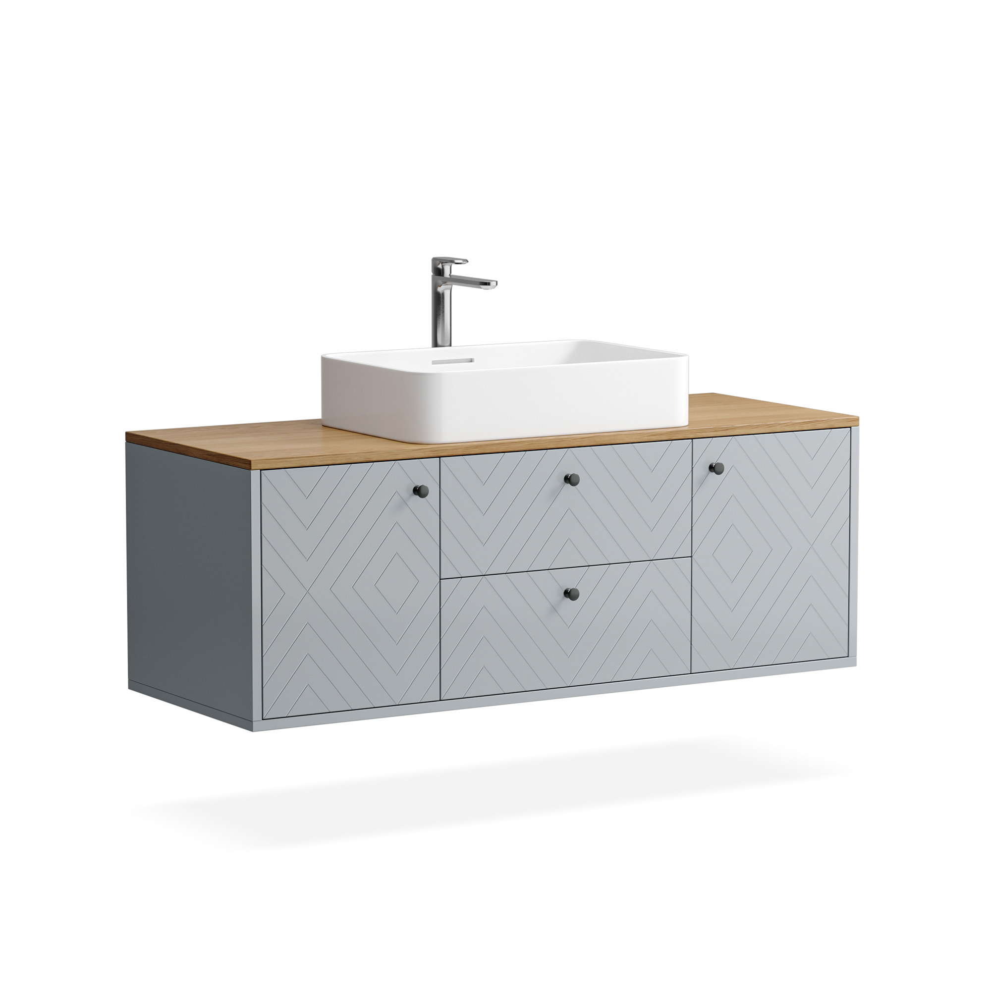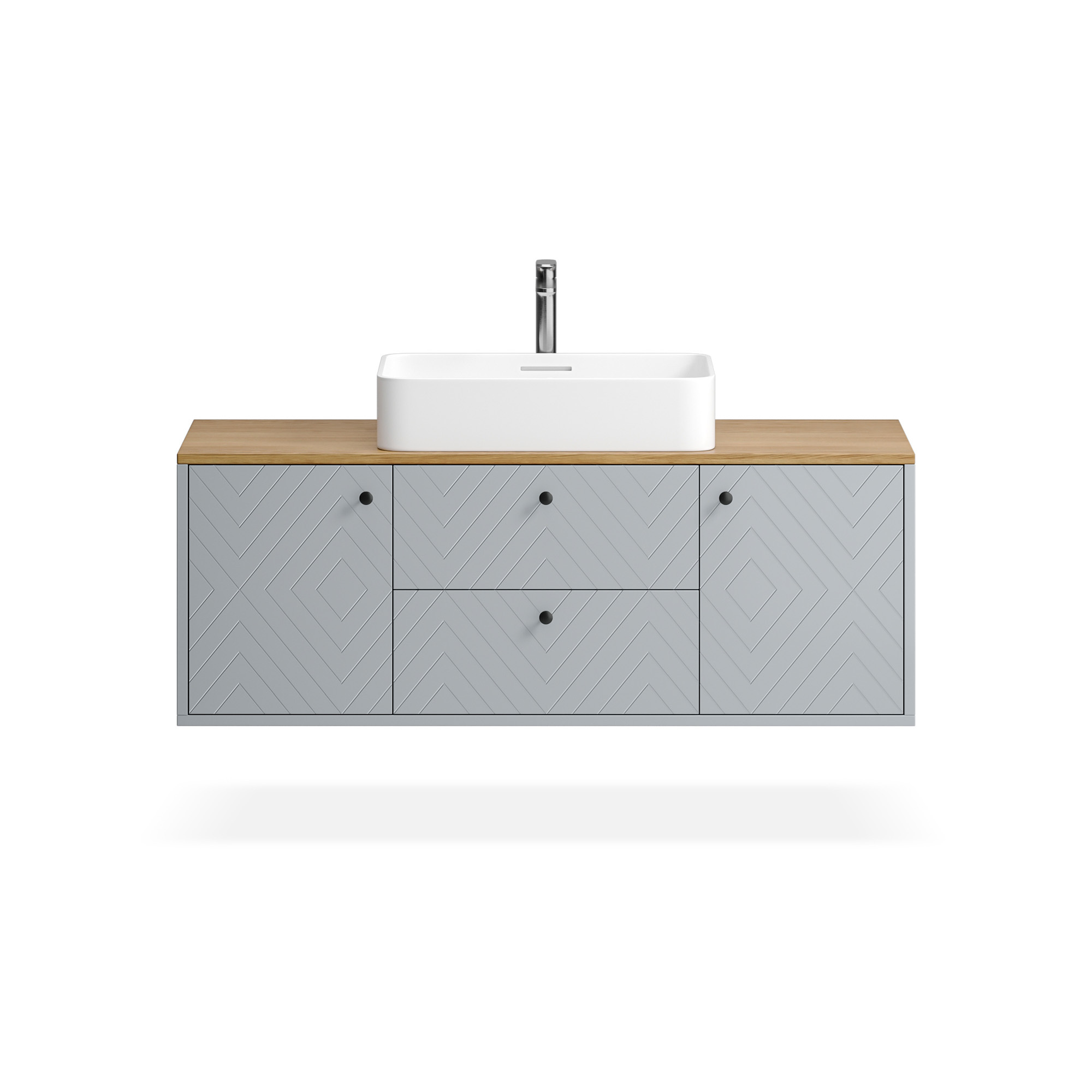 Компактные модели подвесных тумб из трёх секций с выдвижными ящиками и полками гармонично сочетаются с линейкой накладных раковин большинства производителей.