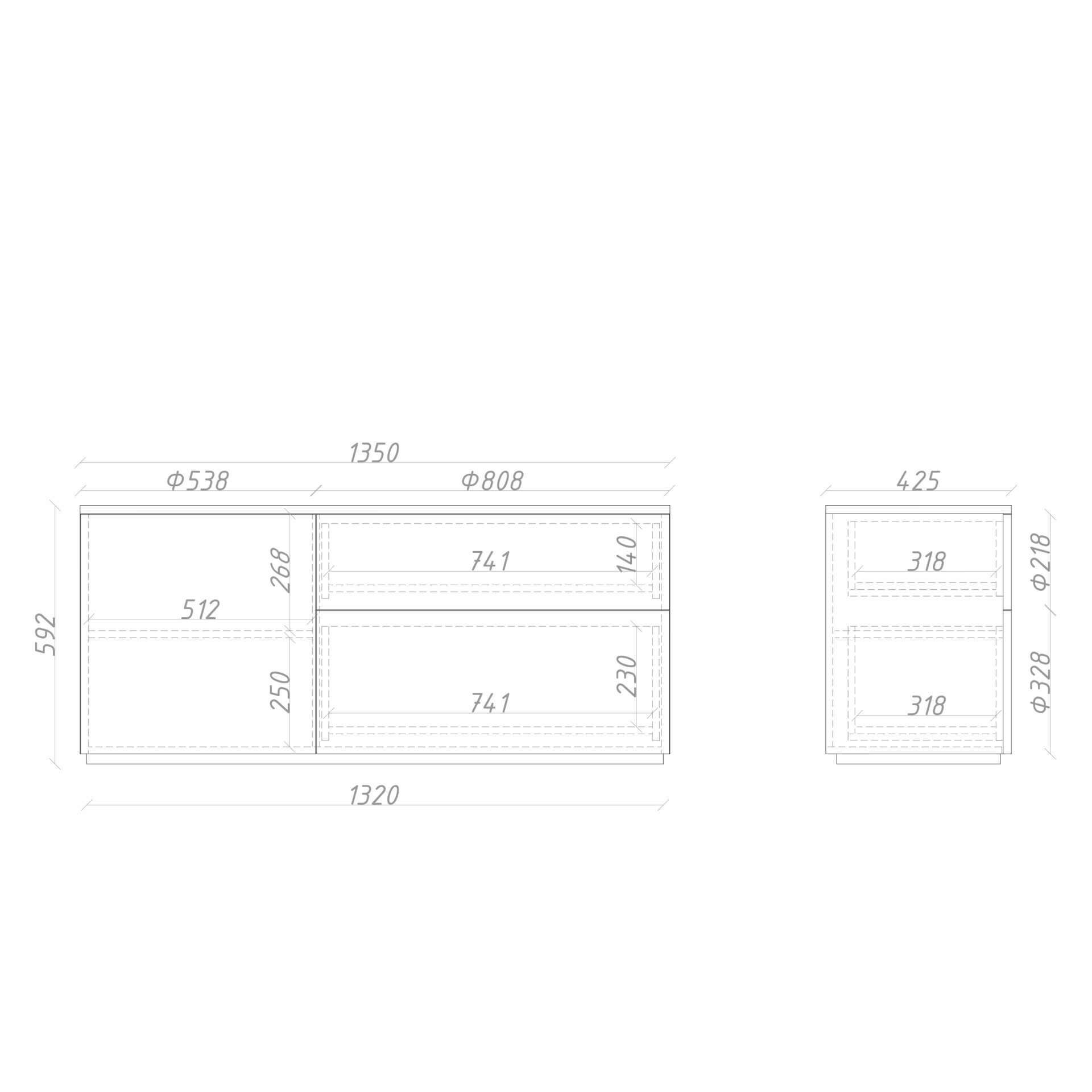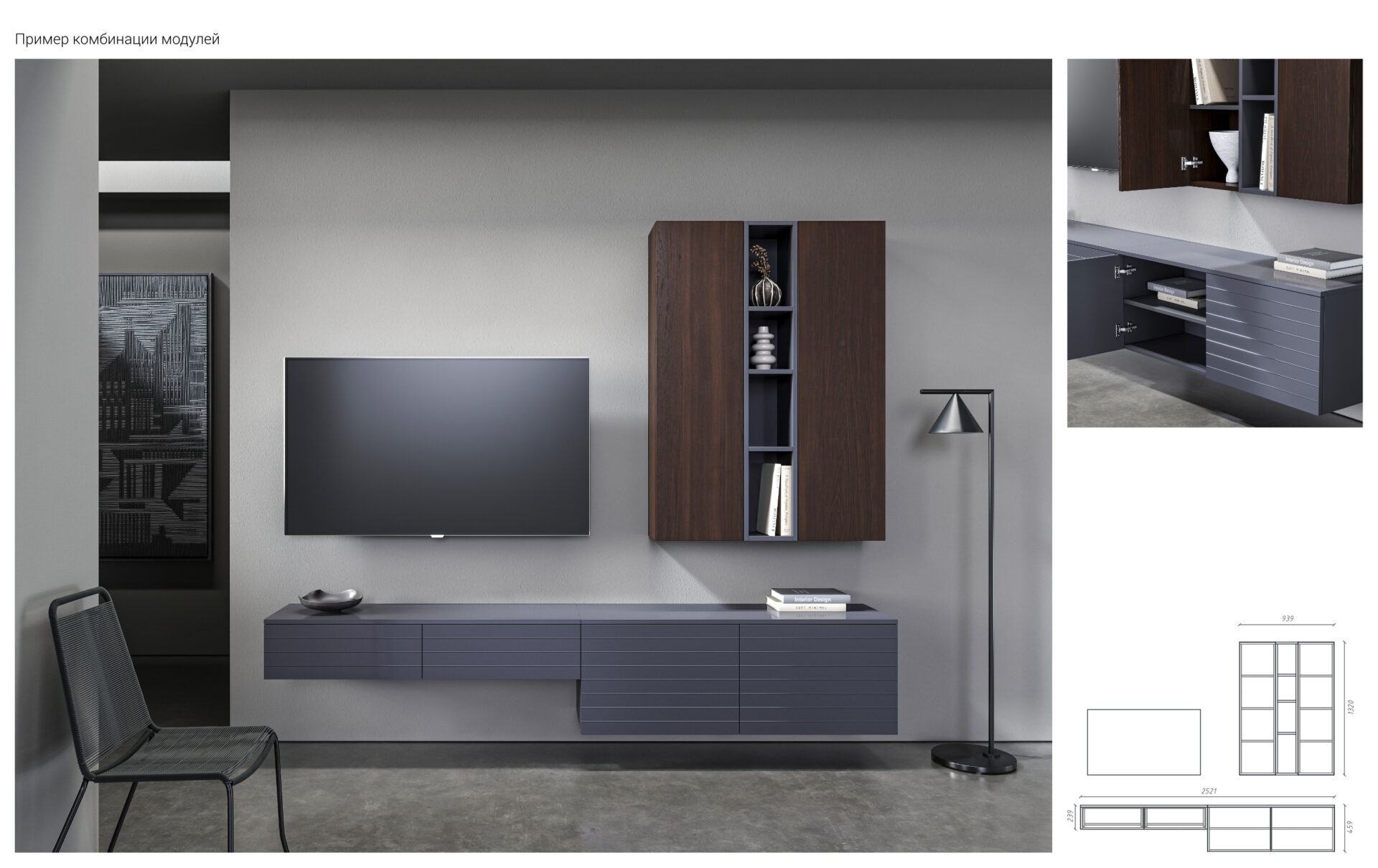 нескольких предметов: консоли, подвесные тумбы и пеналы разной высоты, комоды,