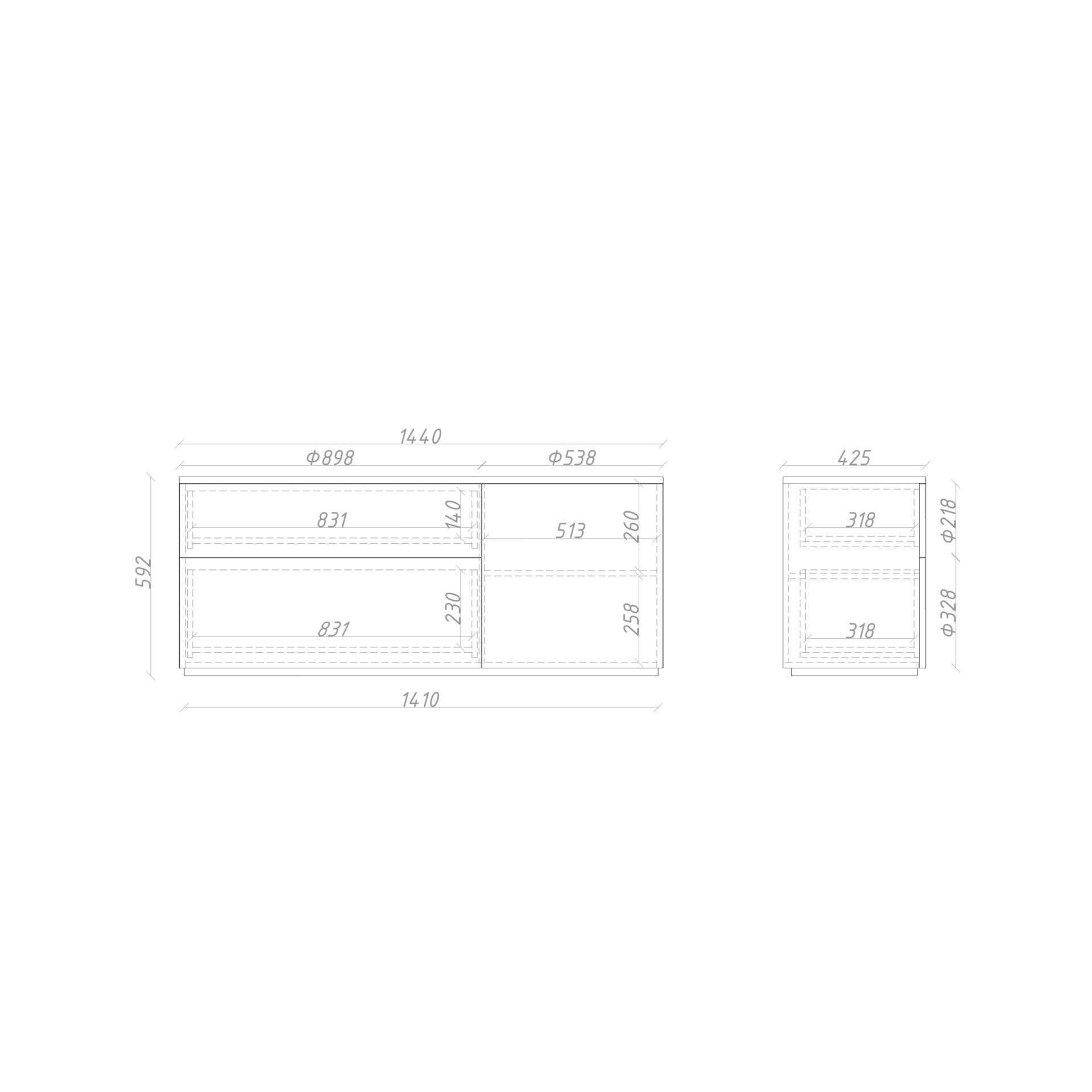 нескольких предметов: консоли, подвесные тумбы и пеналы разной высоты, комоды,