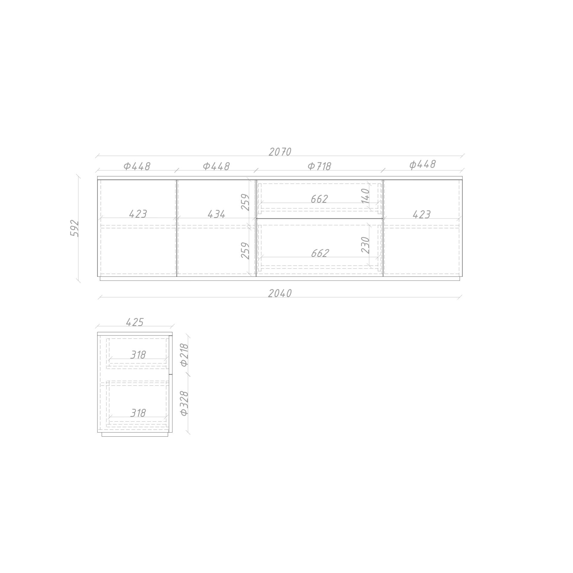 нескольких предметов: консоли, подвесные тумбы и пеналы разной высоты, комоды,