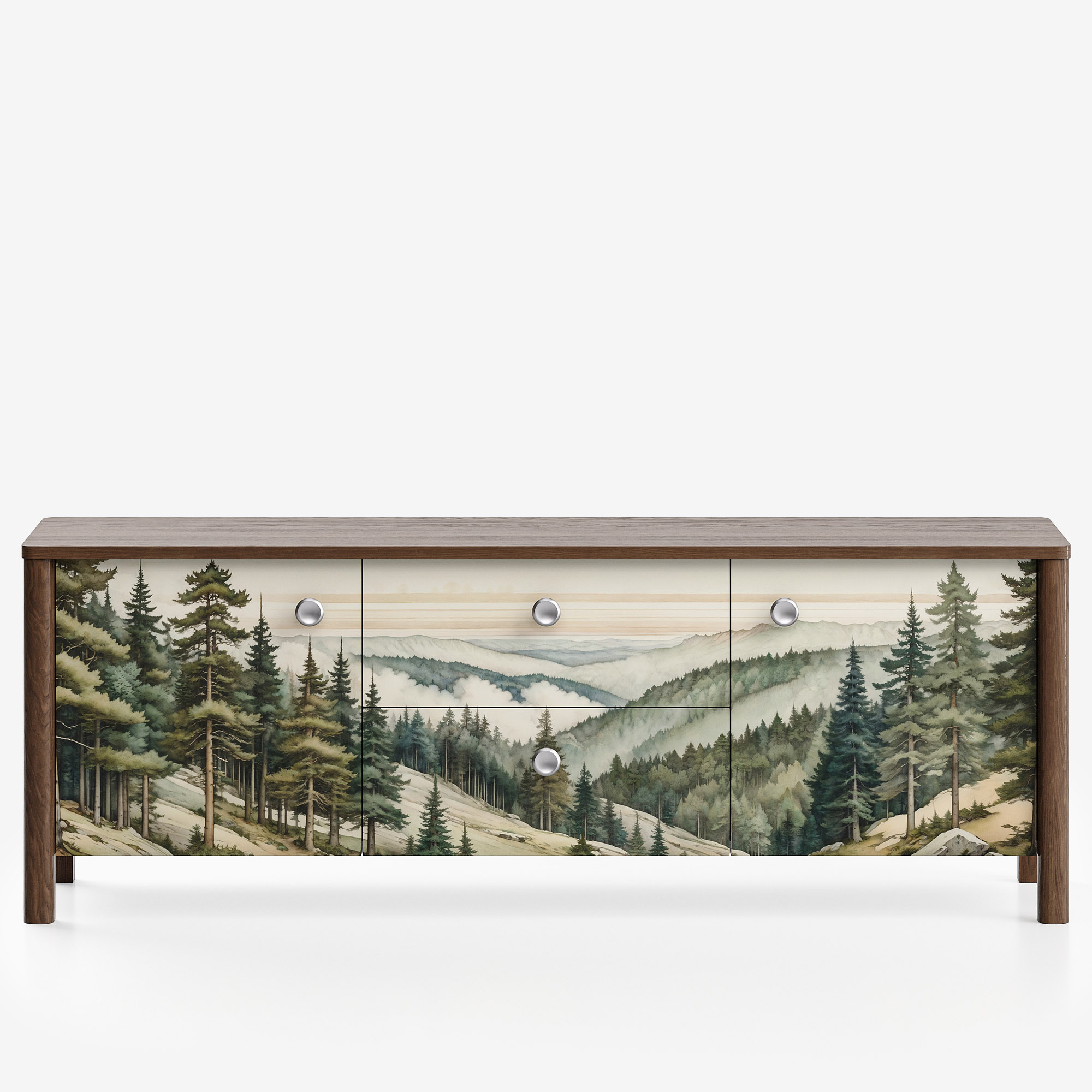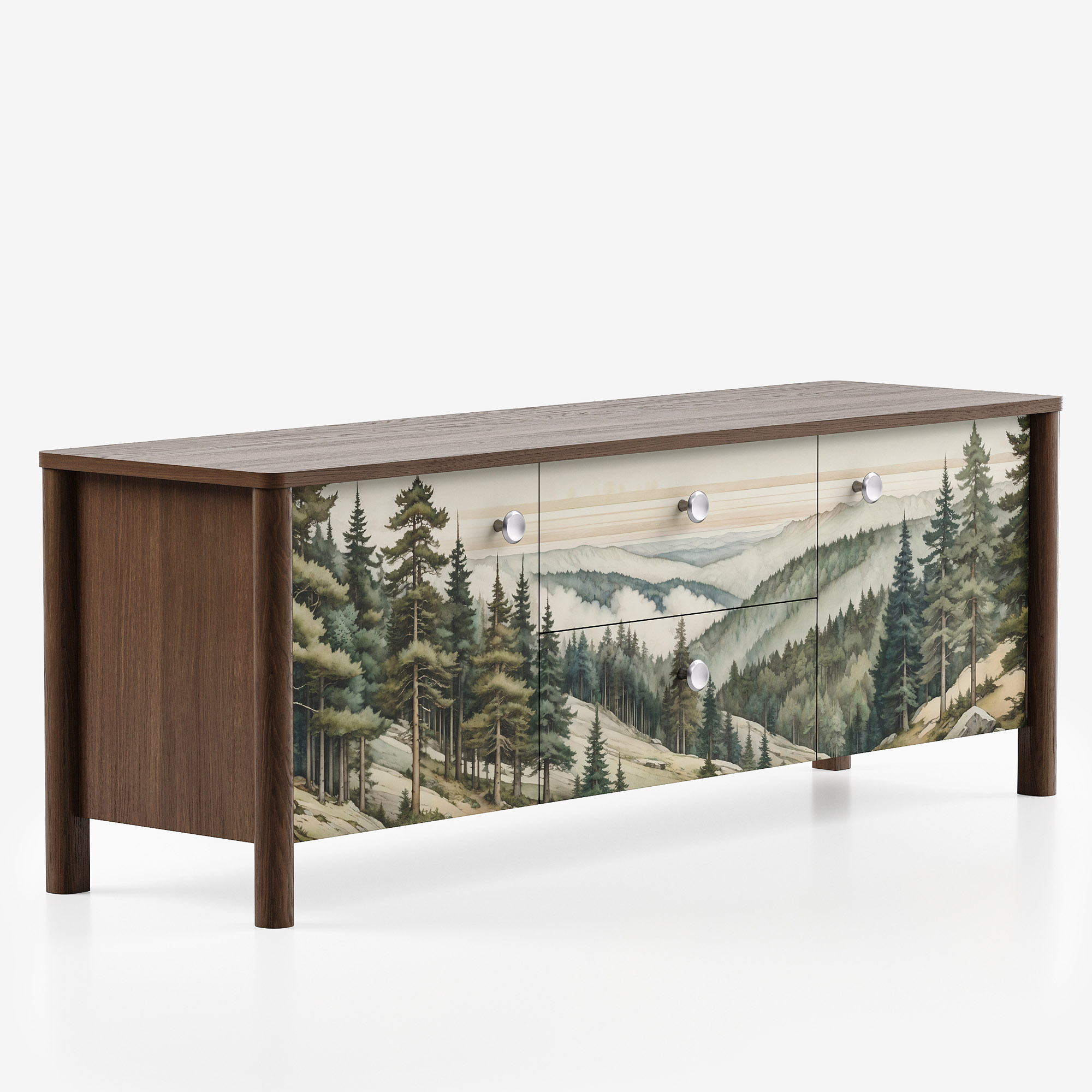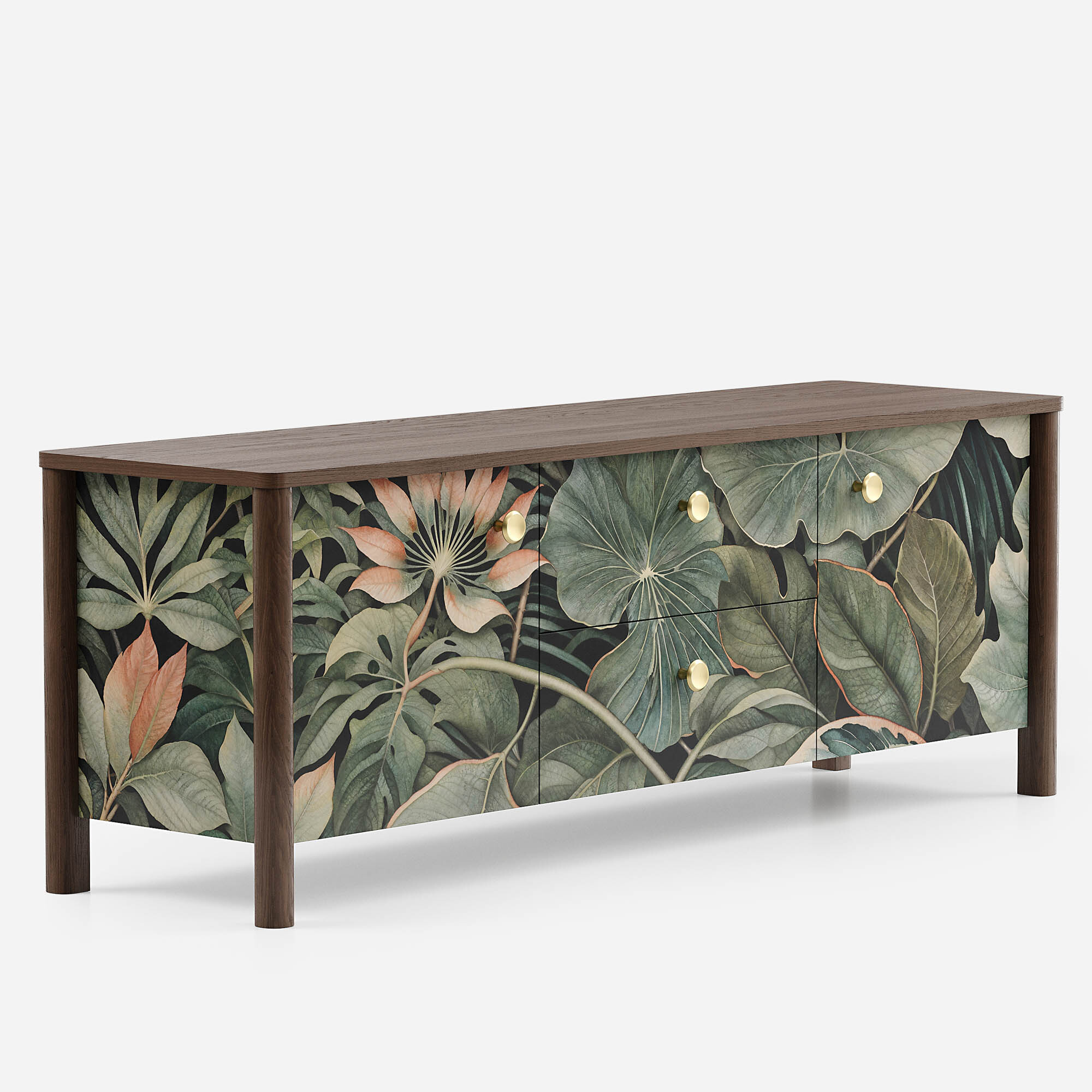 Уникальное сочетание скандинавской эстетики mid-century и цифрового искусства. Строгая симметрия, мягкие каплевидные ножки и эксклюзивные принты из коллекции INSPIRE создают медиацентр, который становится ключевым арт-объектом в интерьере. Это больше, чем тумба — это визуальное заявление, организующее пространство с безупречным вкусом.