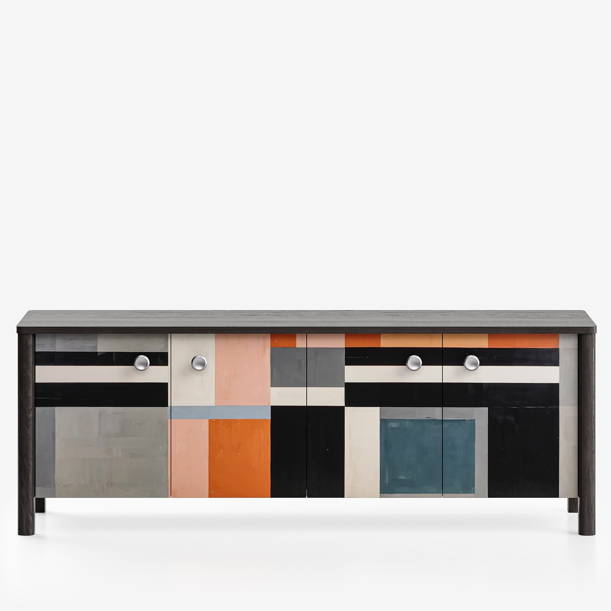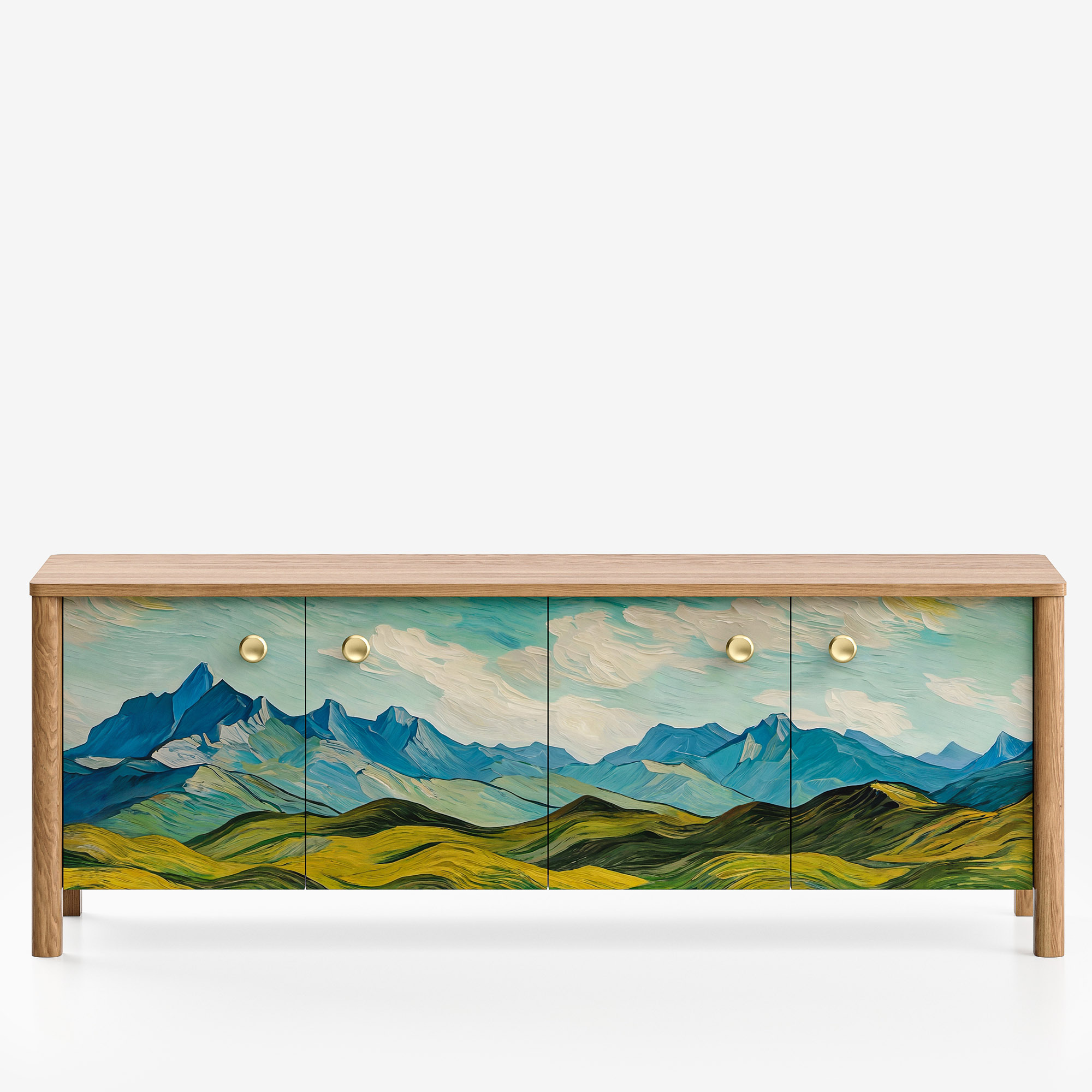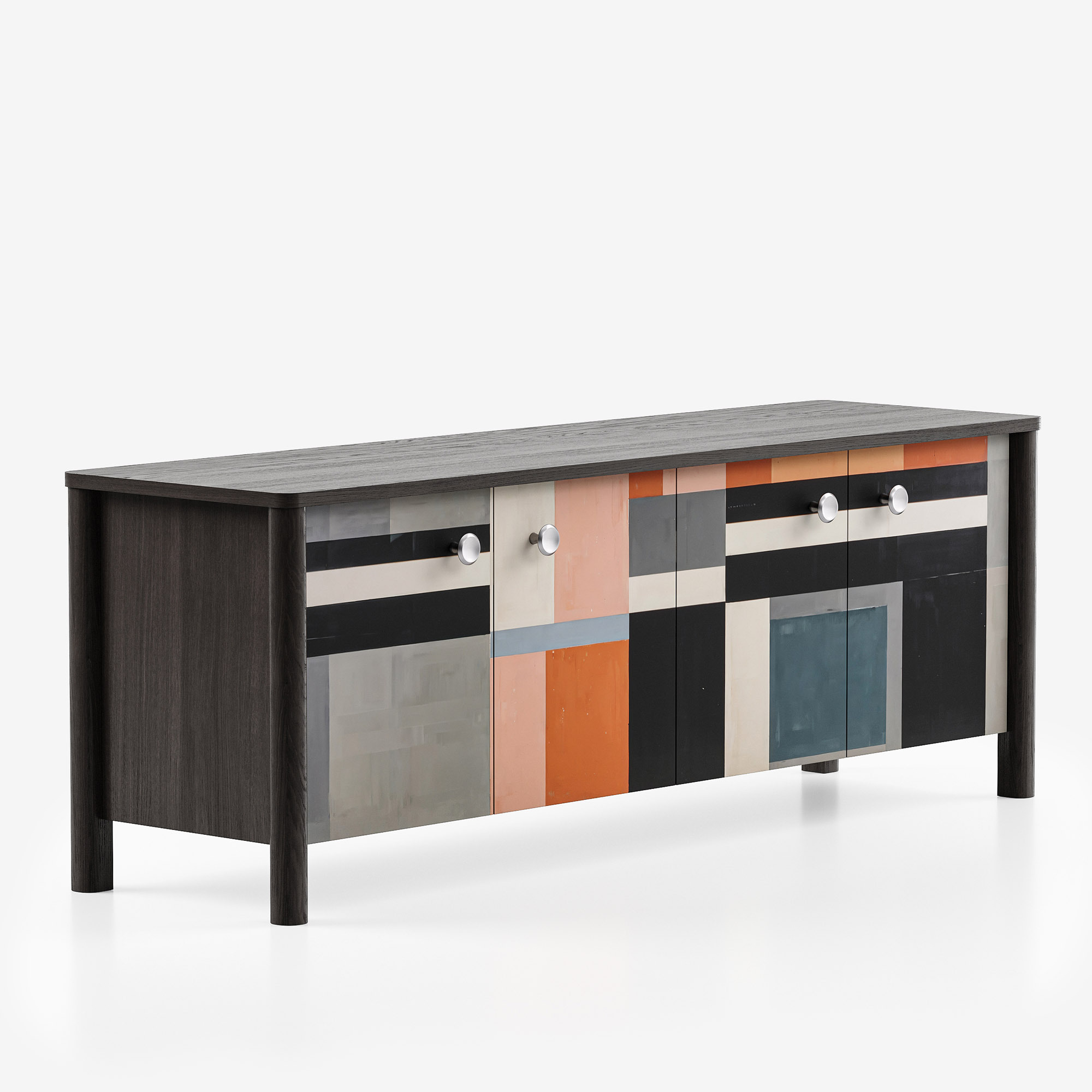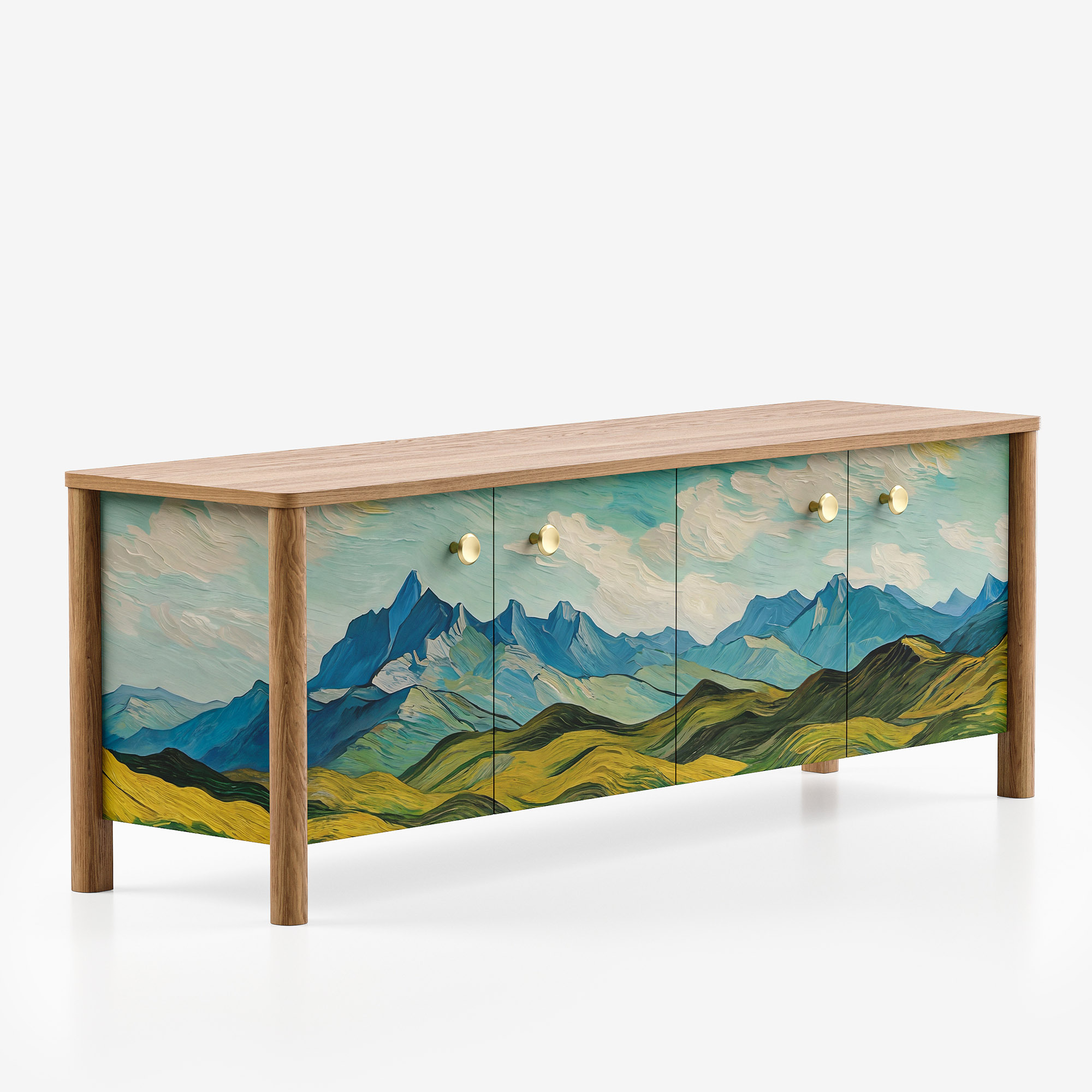 Уникальное сочетание скандинавской эстетики mid-century и цифрового искусства. Строгая симметрия, мягкие каплевидные ножки и эксклюзивные принты из коллекции INSPIRE создают медиацентр, который становится ключевым арт-объектом в интерьере. Это больше, чем тумба — это визуальное заявление, организующее пространство с безупречным вкусом.