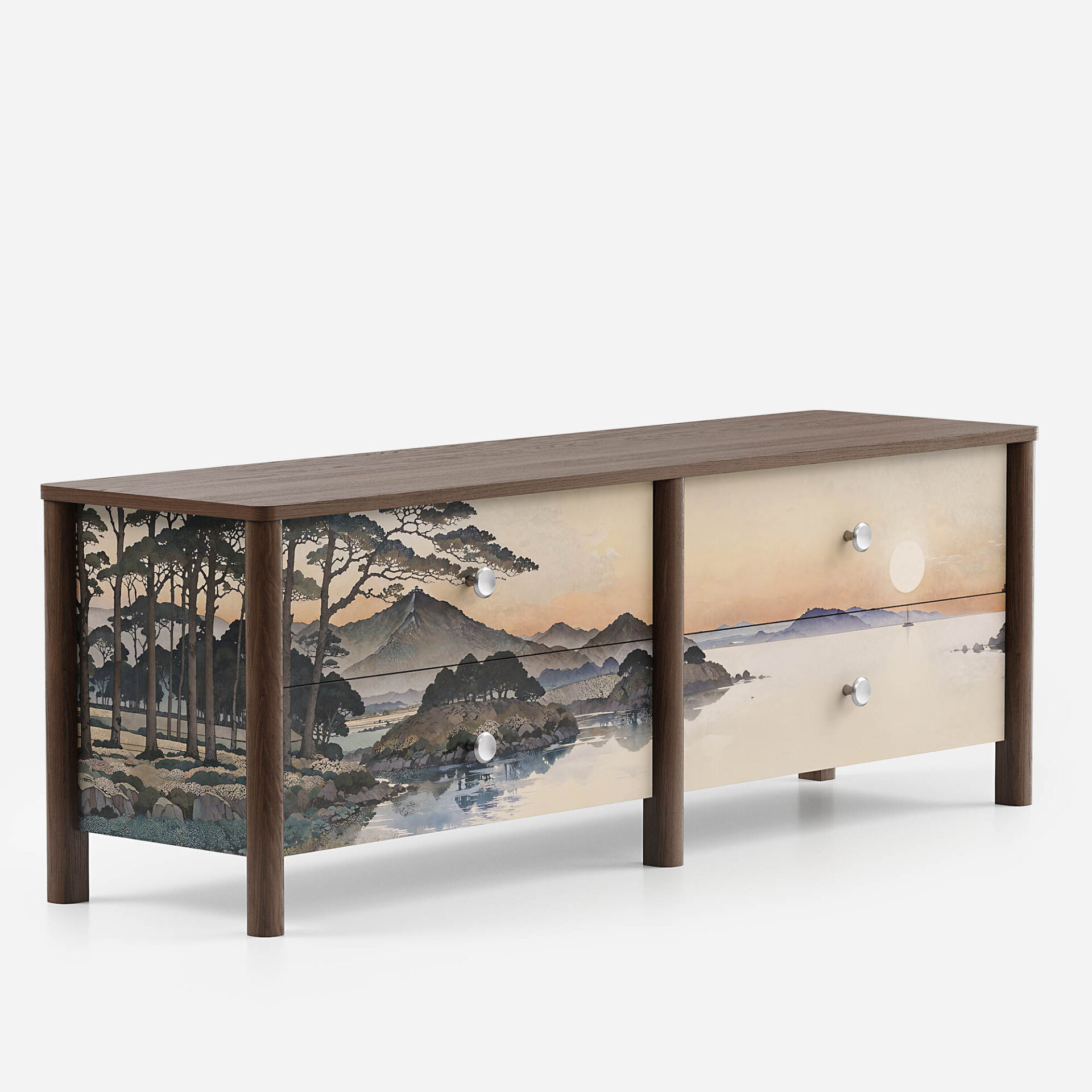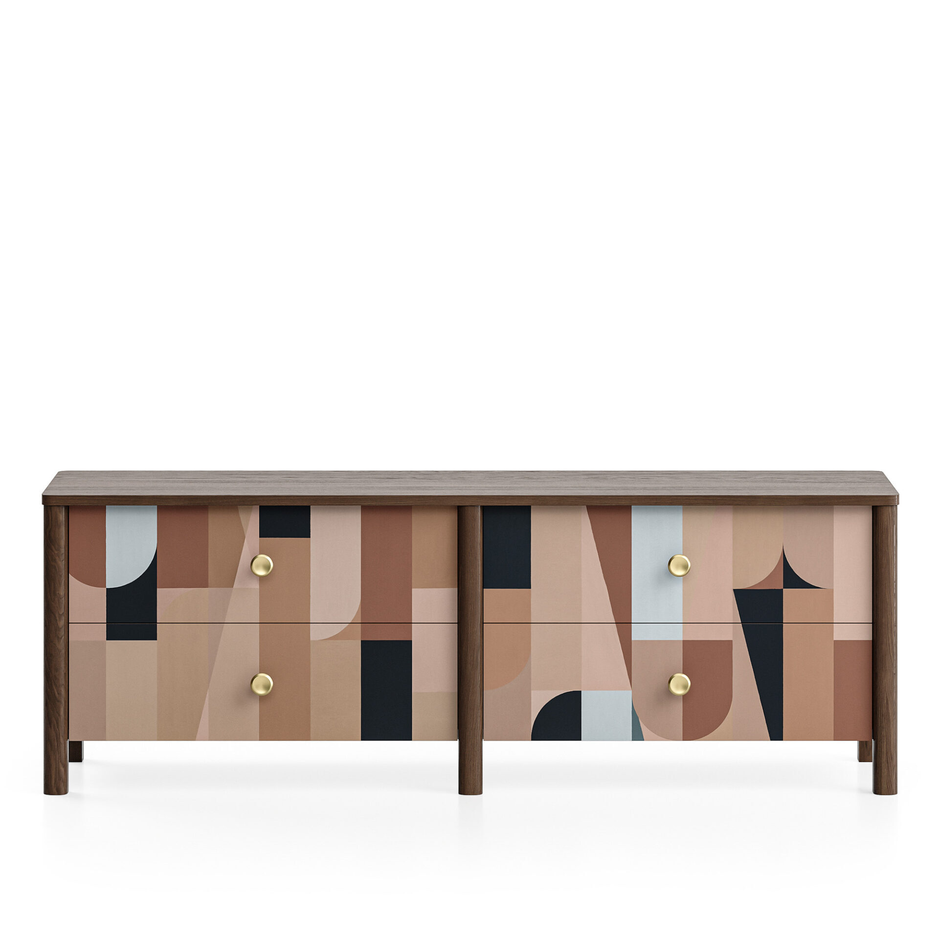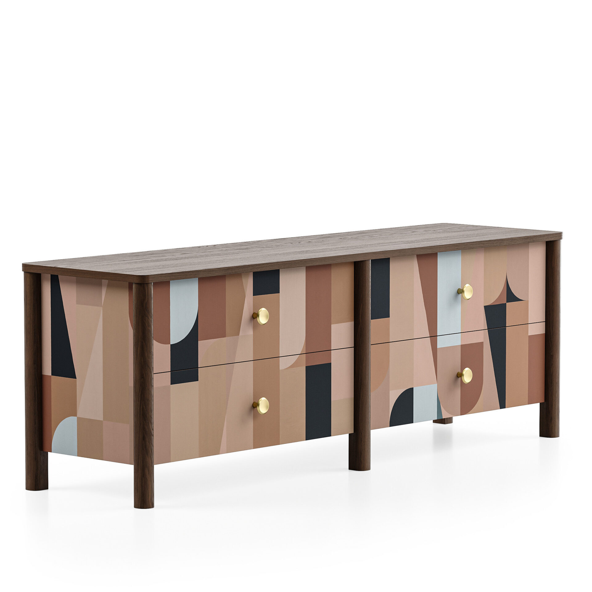 Уникальное сочетание скандинавской эстетики mid-century и цифрового искусства. Строгая симметрия, мягкие каплевидные ножки и эксклюзивные принты из коллекции INSPIRE создают медиацентр, который становится ключевым арт-объектом в интерьере. Это больше, чем тумба — это визуальное заявление, организующее пространство с безупречным вкусом.