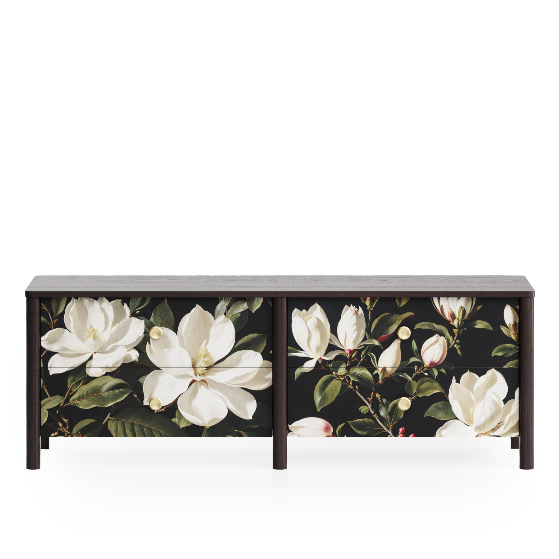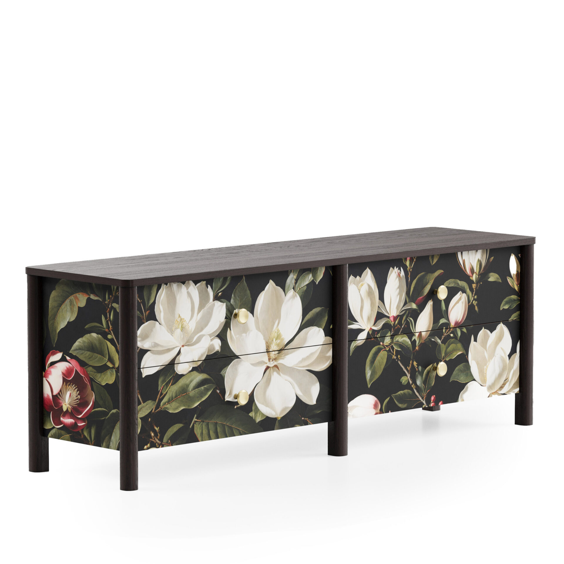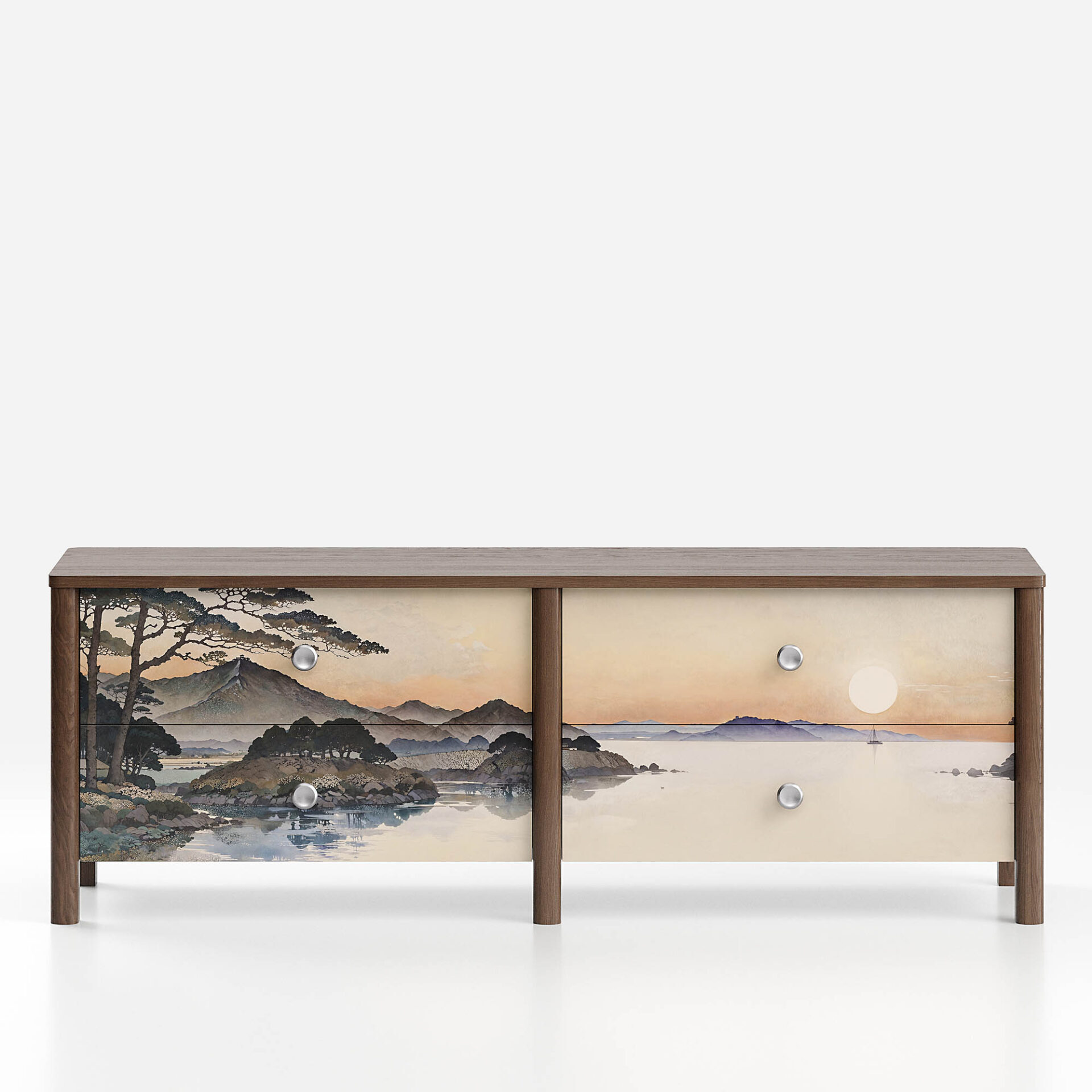 Уникальное сочетание скандинавской эстетики mid-century и цифрового искусства. Строгая симметрия, мягкие каплевидные ножки и эксклюзивные принты из коллекции INSPIRE создают медиацентр, который становится ключевым арт-объектом в интерьере. Это больше, чем тумба — это визуальное заявление, организующее пространство с безупречным вкусом.