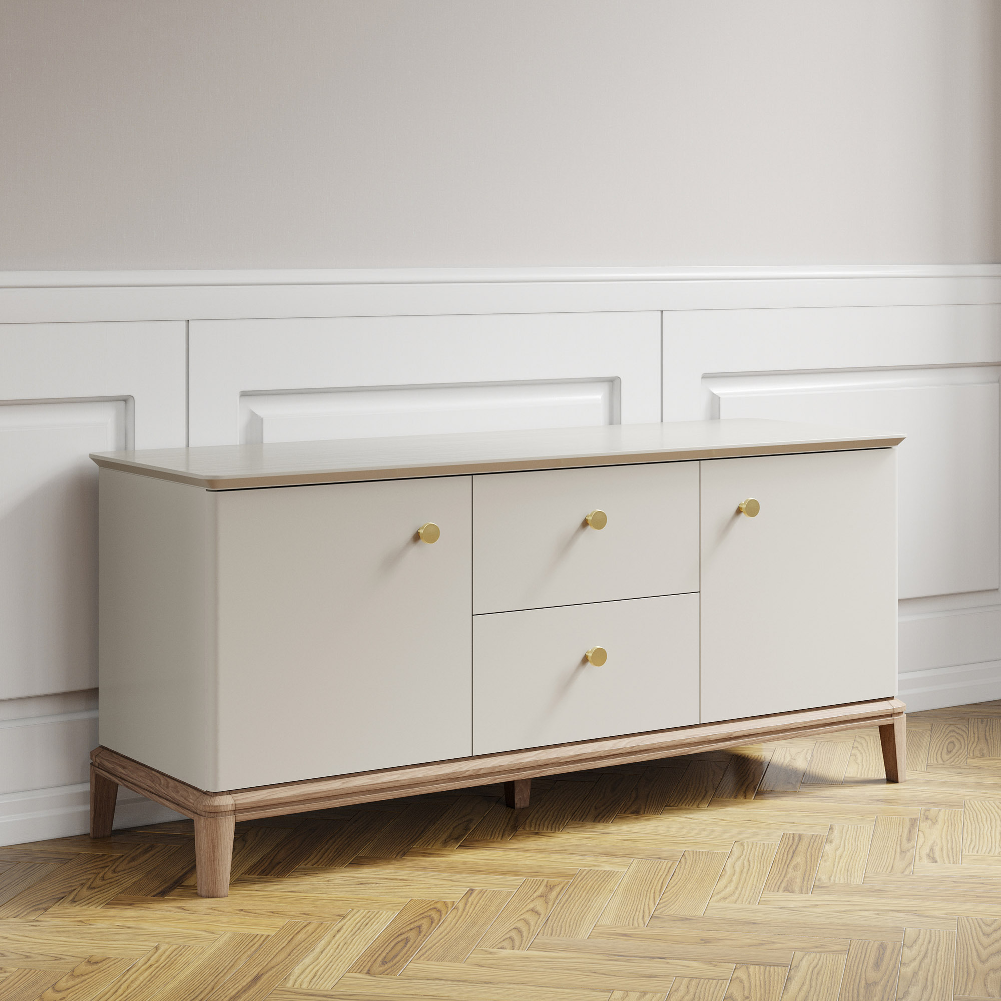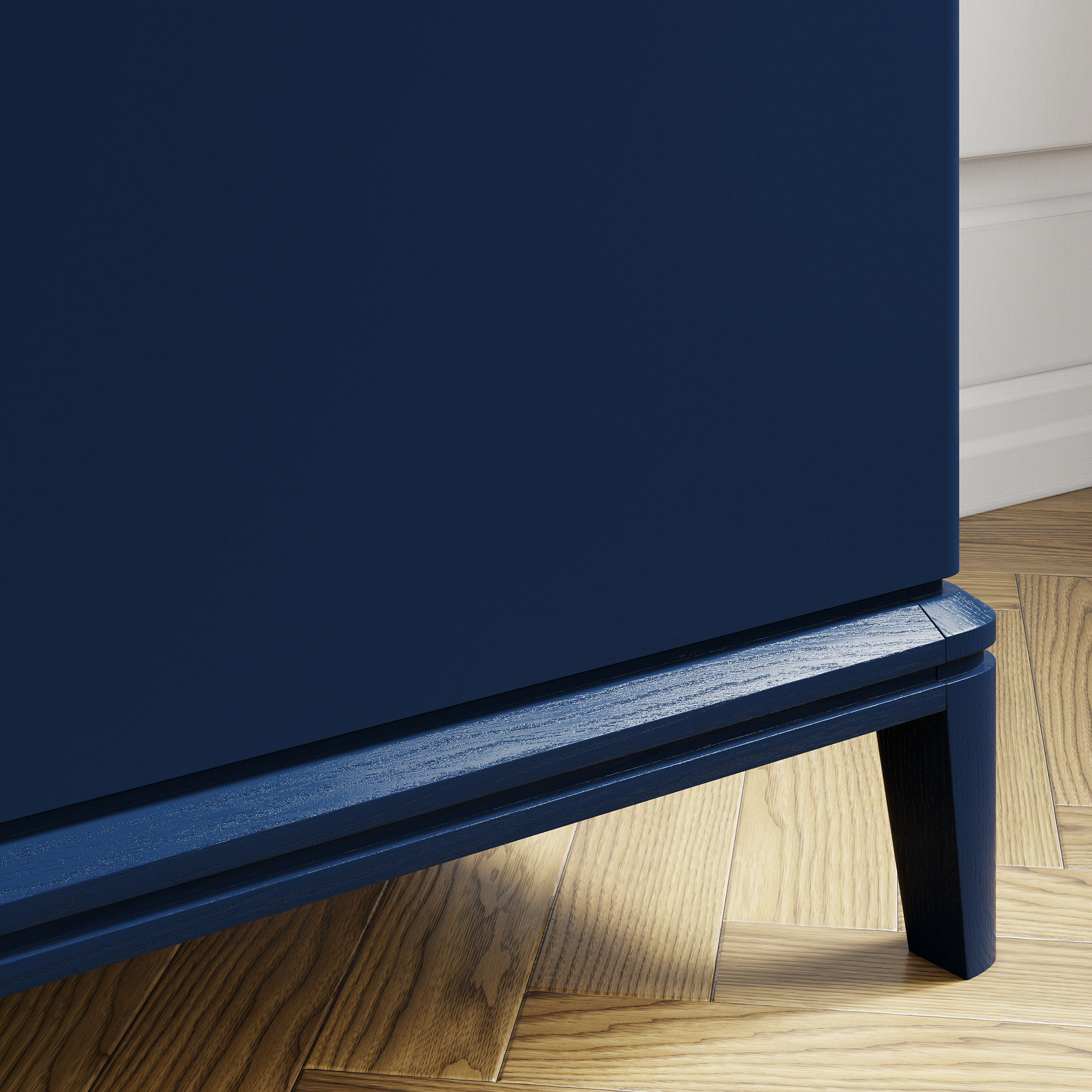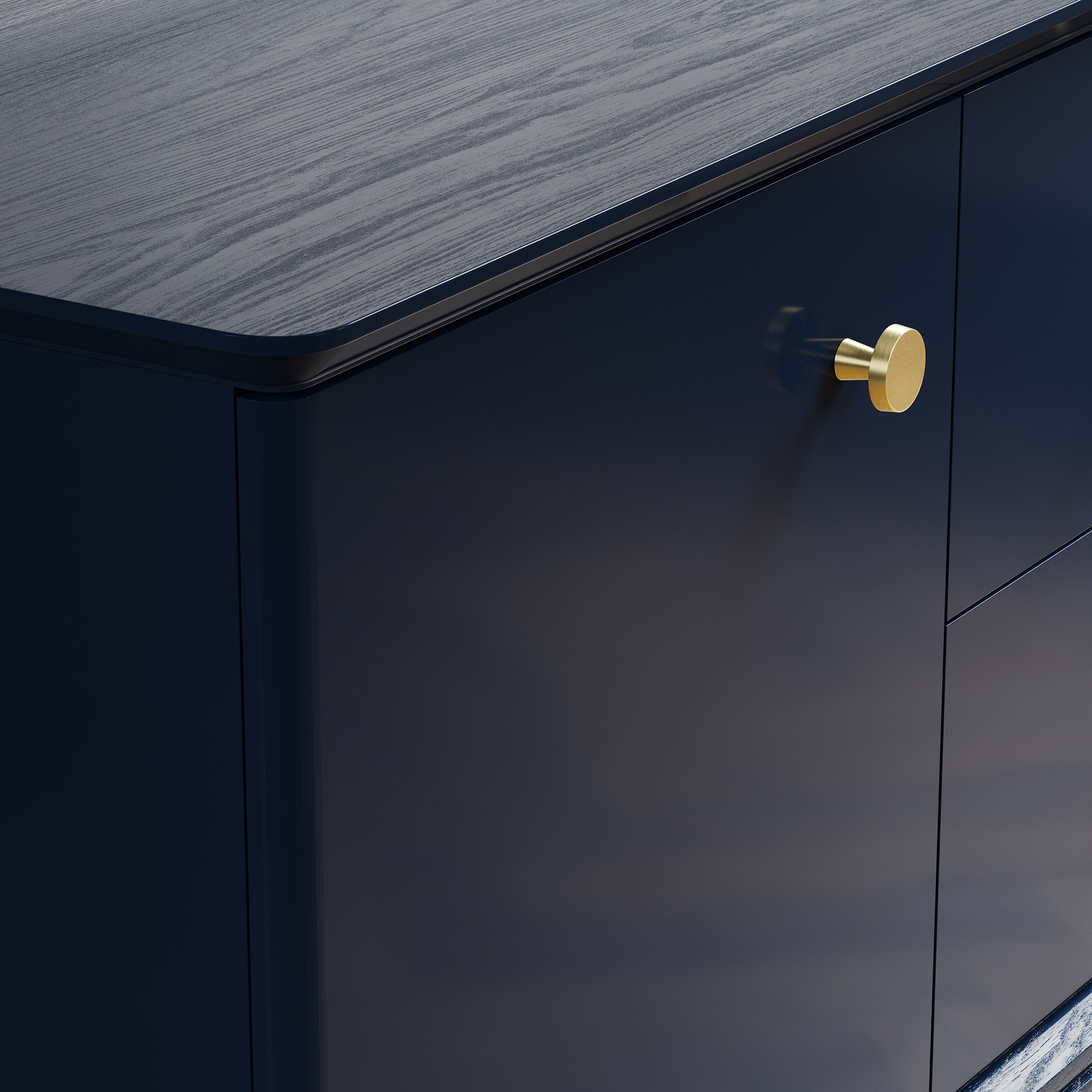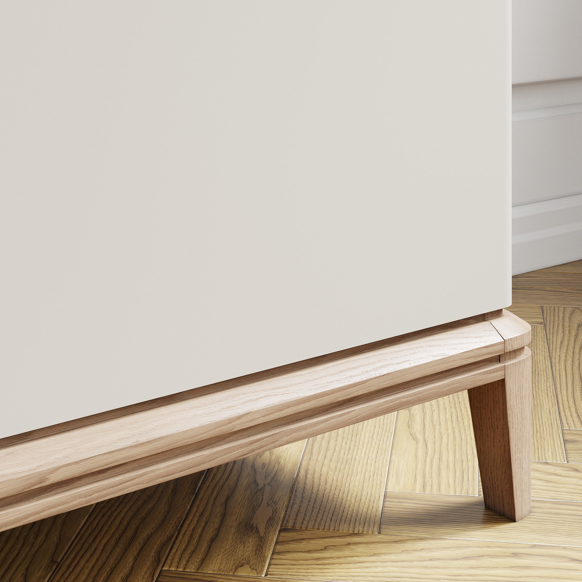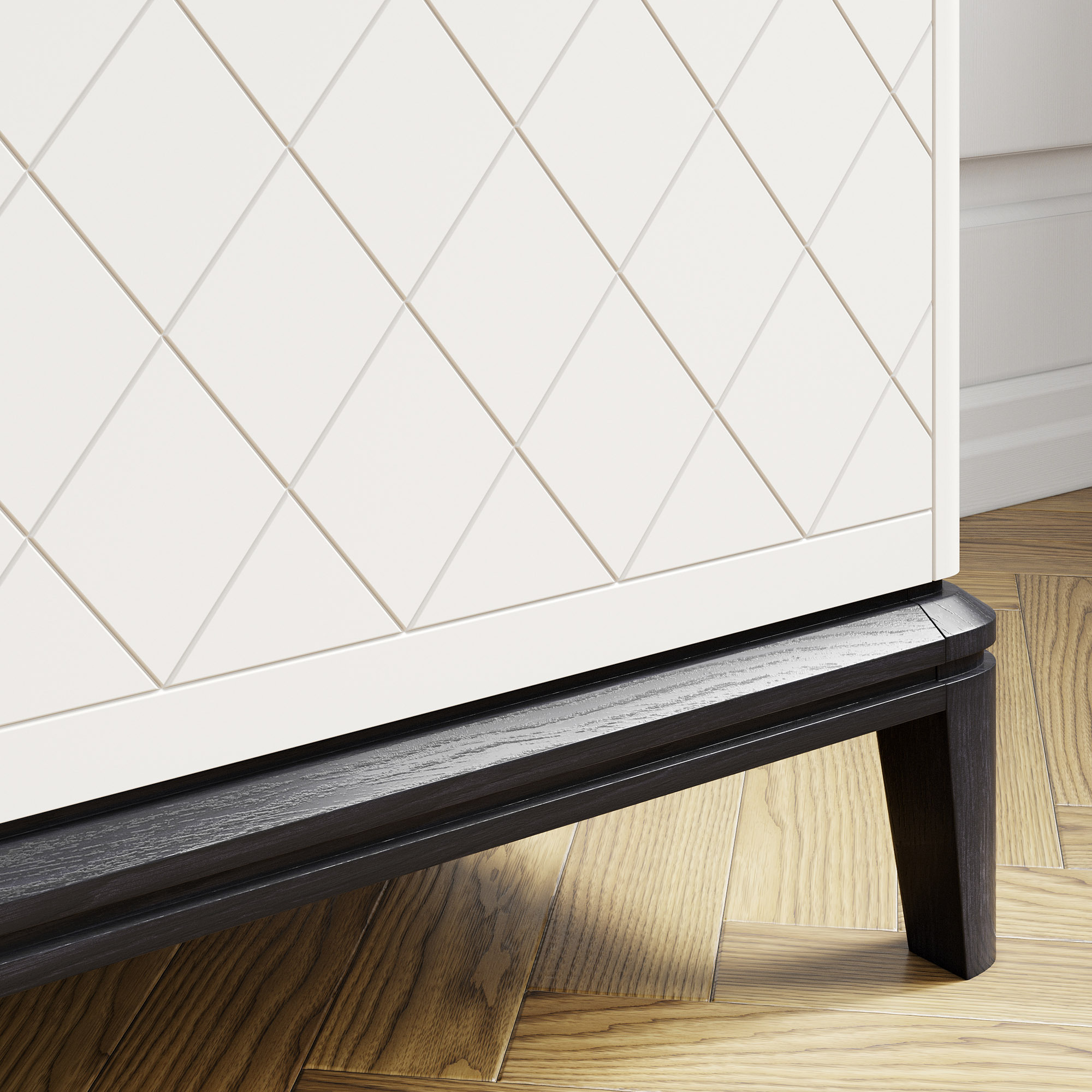 Эксклюзивные детали: массивные ручки-кнопки в четырех исполнениях и многогранные ножки и цоколь из массива дуба, обработанные вручную.