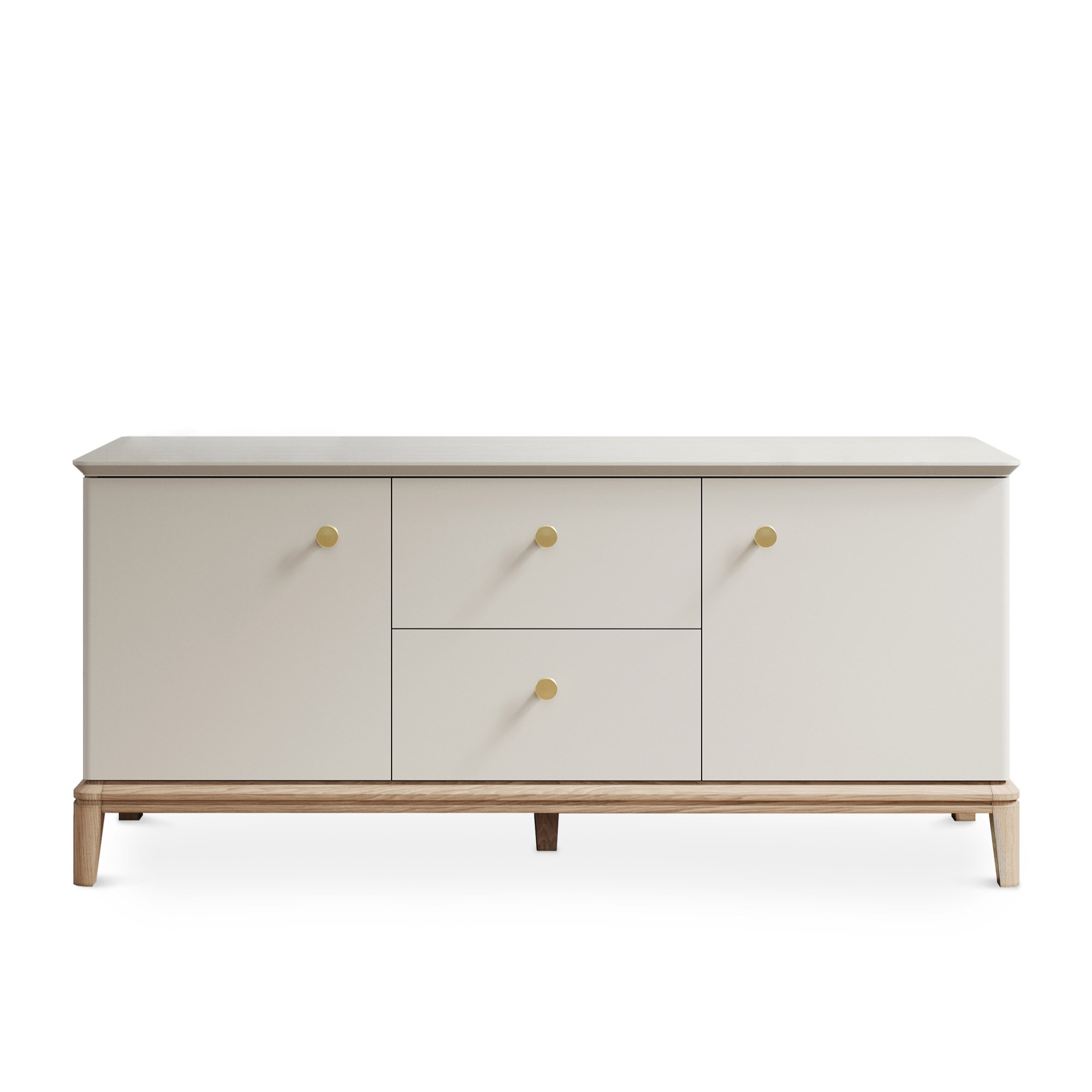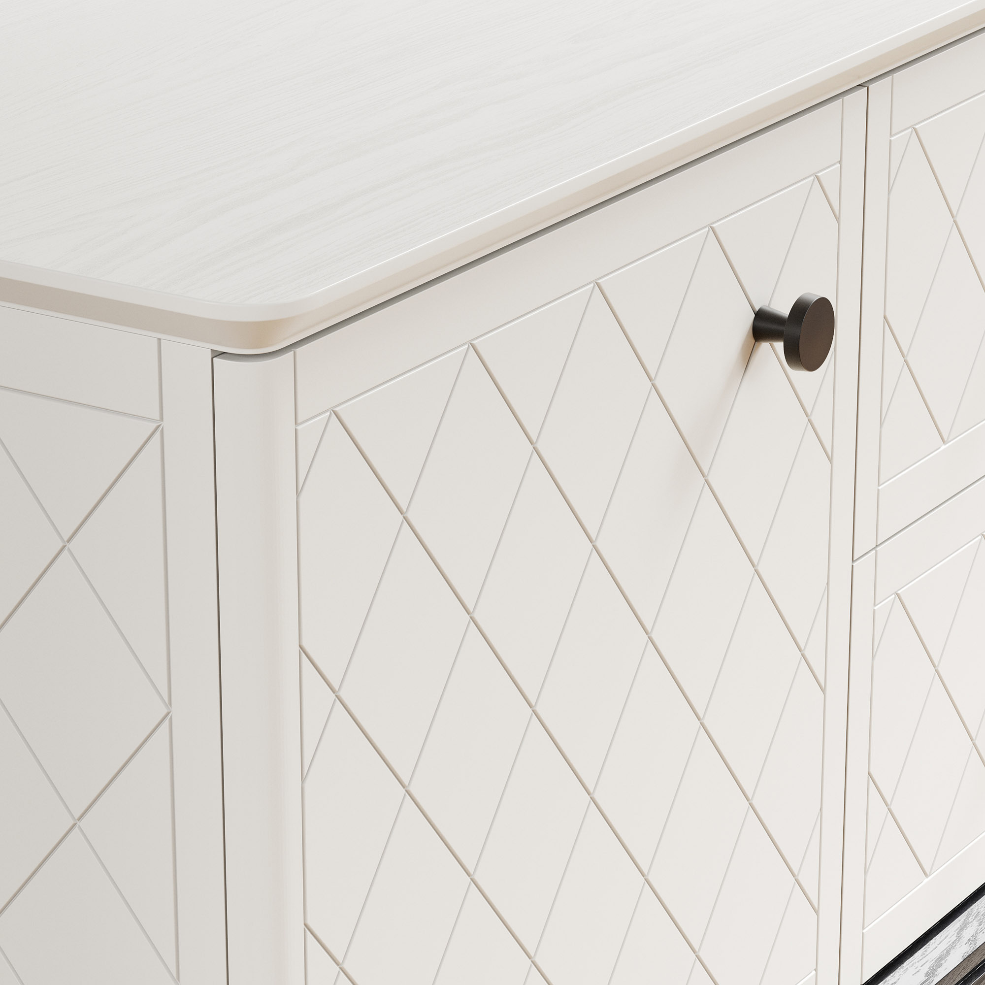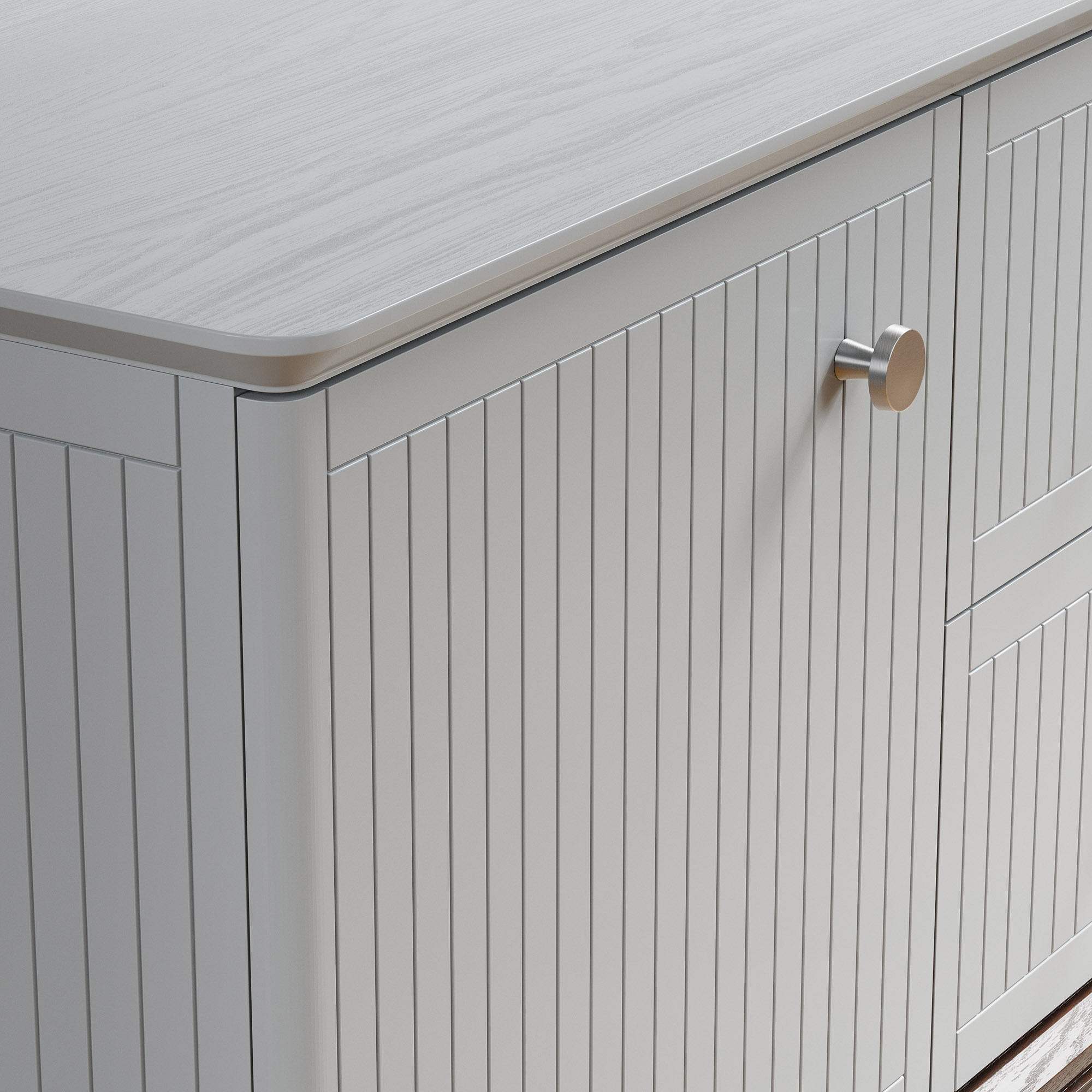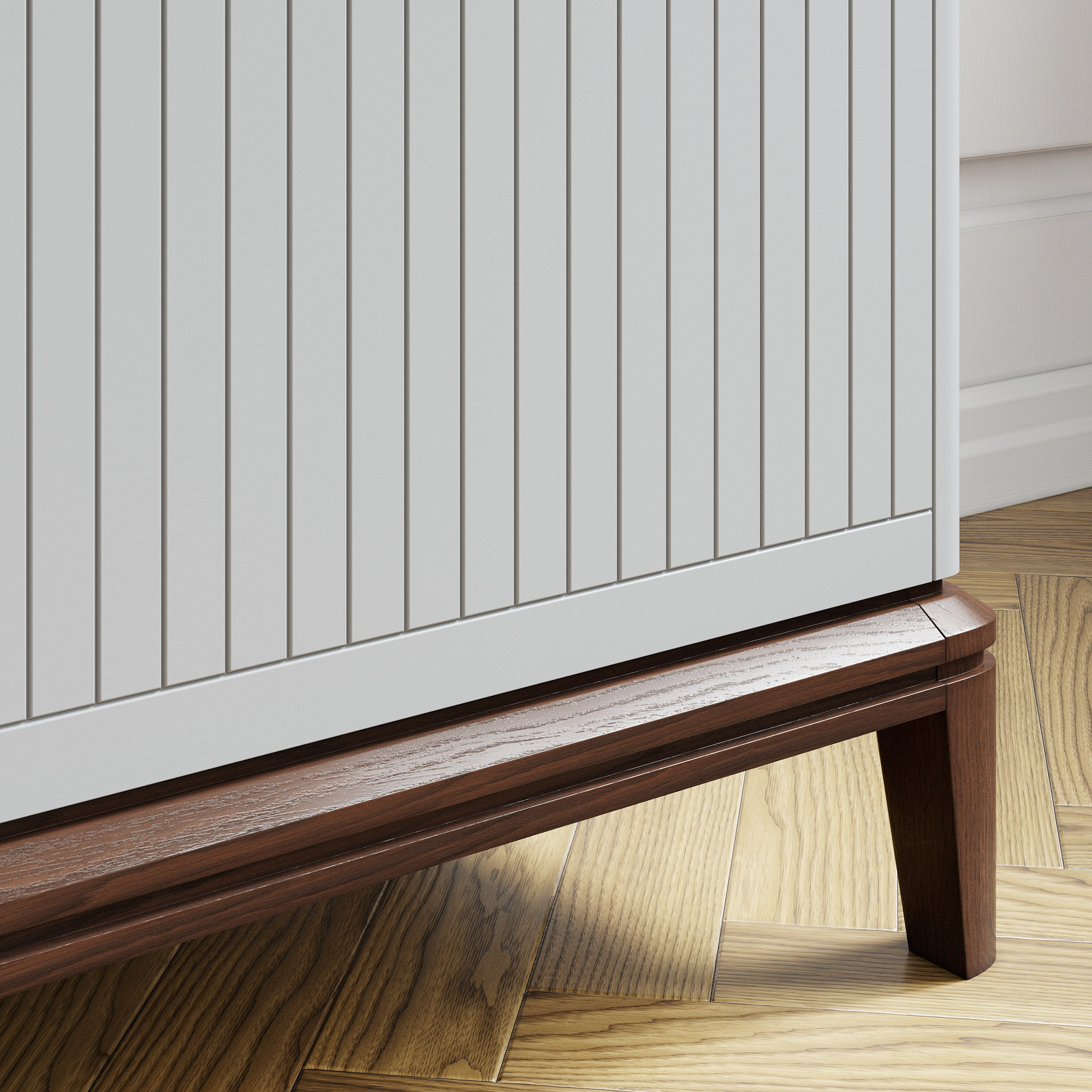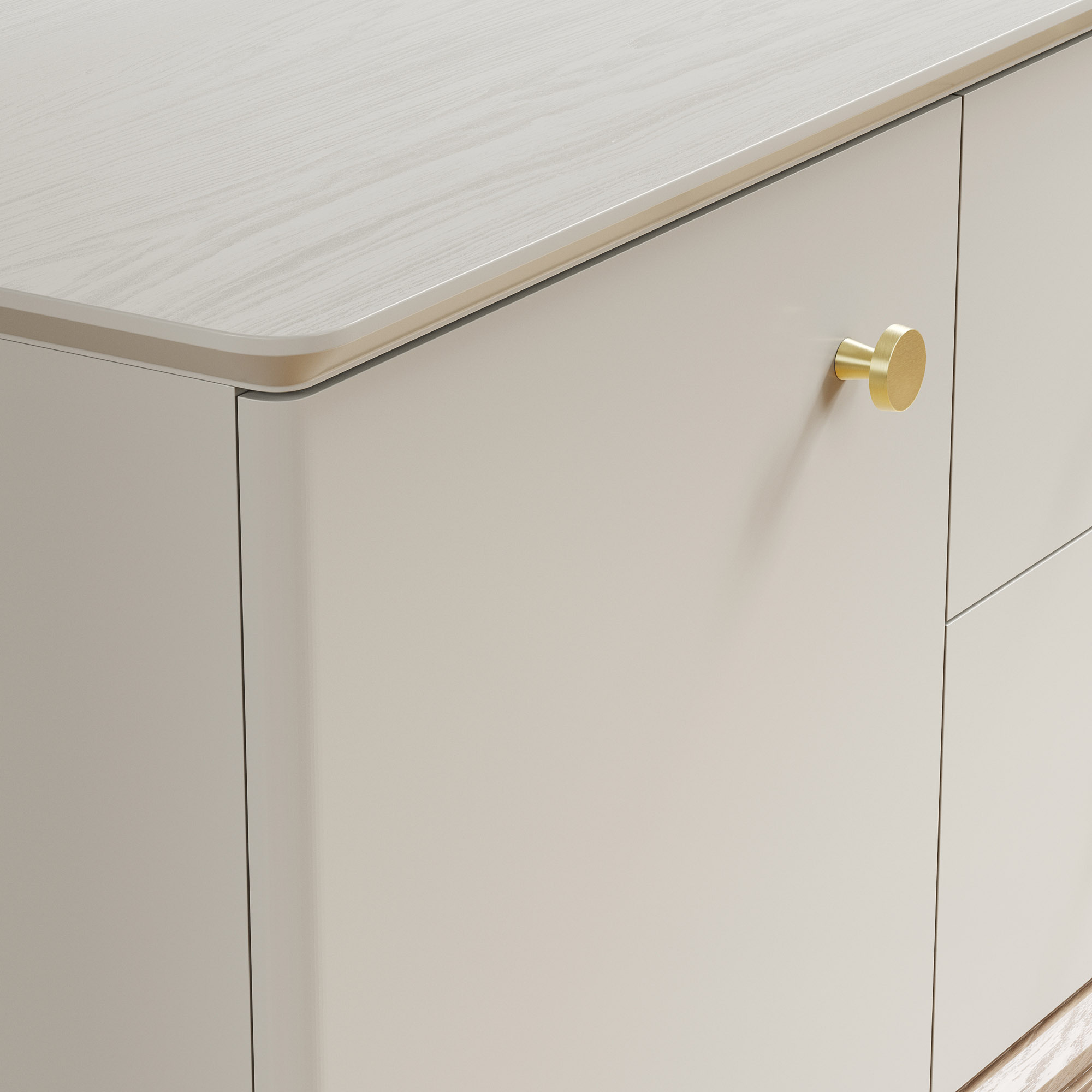 Эксклюзивные детали: массивные ручки-кнопки в четырех исполнениях и многогранные ножки и цоколь из массива дуба, обработанные вручную.