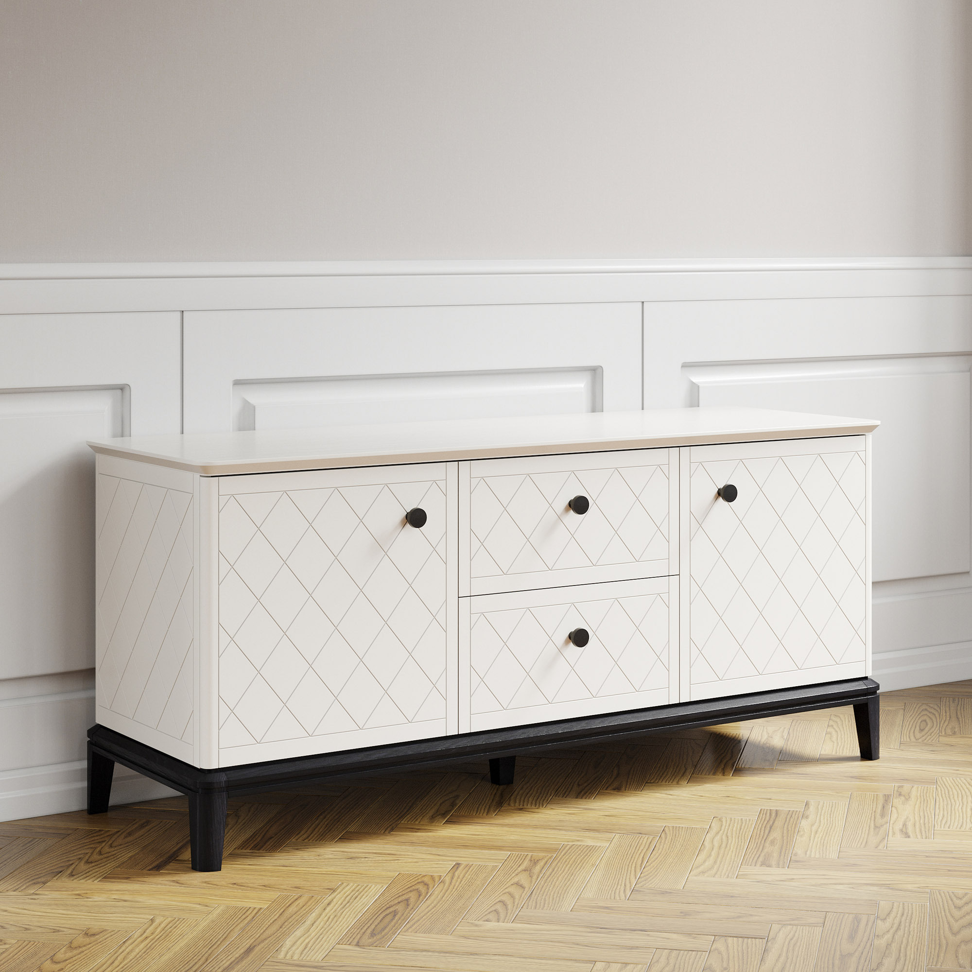 Два просторных ящика и секции с полками создают идеальную систему хранения для медиатехники. Усиленные каркасы выдерживают до 25 кг, а доводчики Hettich обеспечивают плавное закрывание. Регулировка фасадов гарантирует безупречное совпадение узора гравировки.