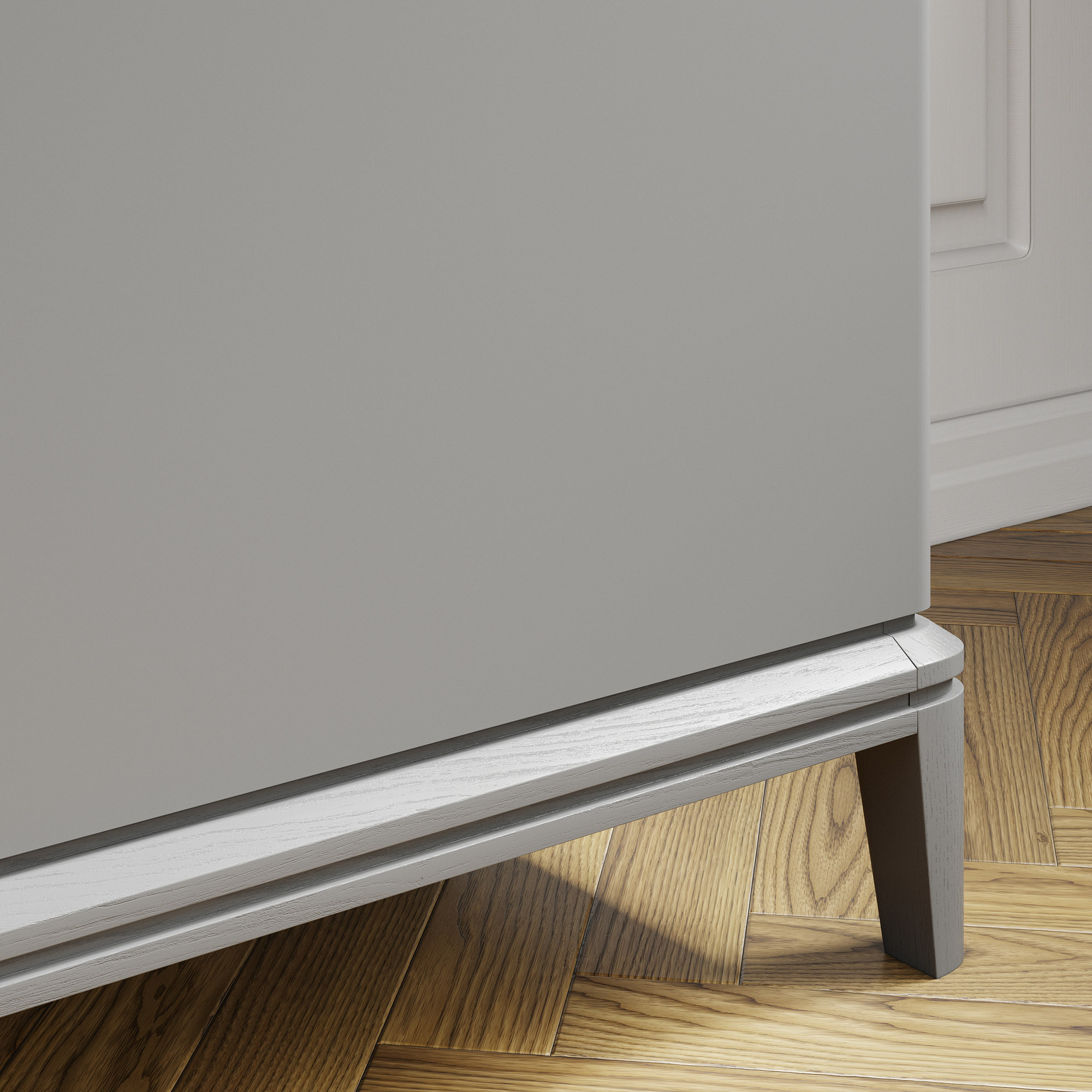 Эксклюзивные детали: массивные ручки-кнопки в четырех исполнениях и многогранные ножки и цоколь из массива дуба, обработанные вручную.