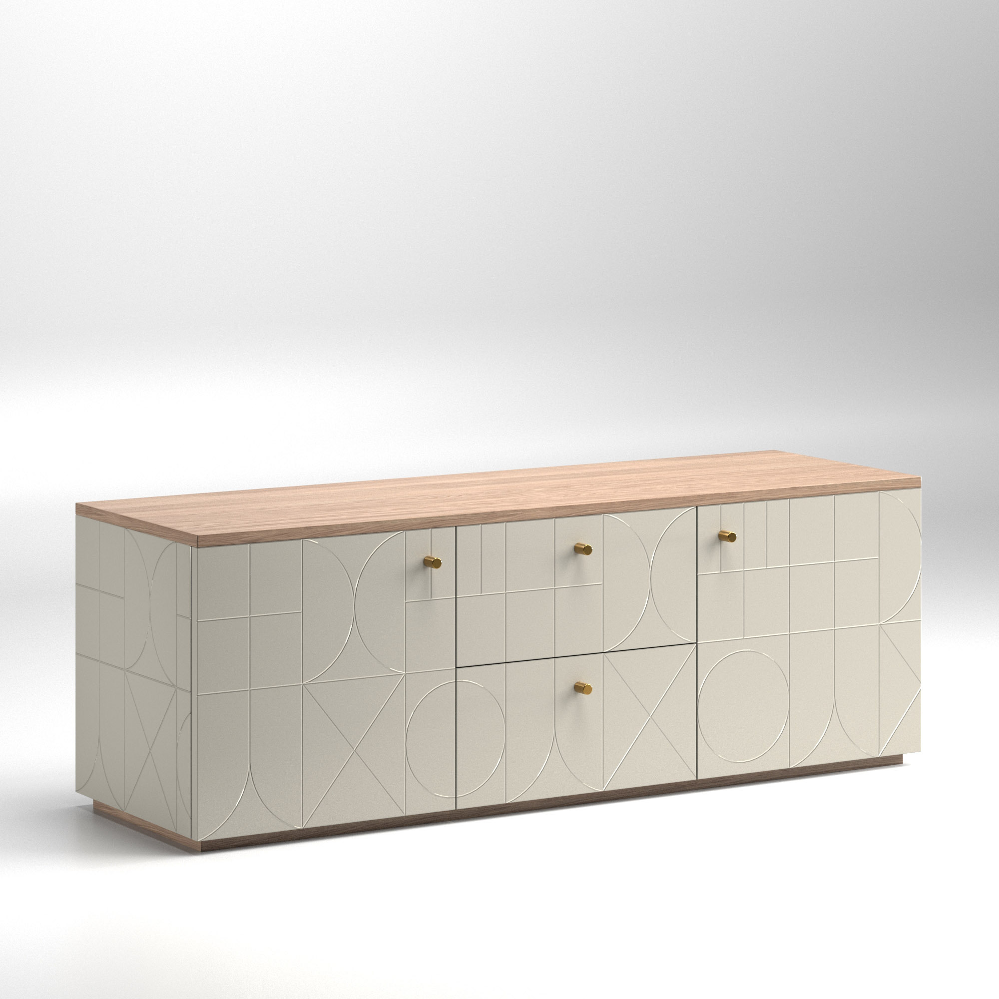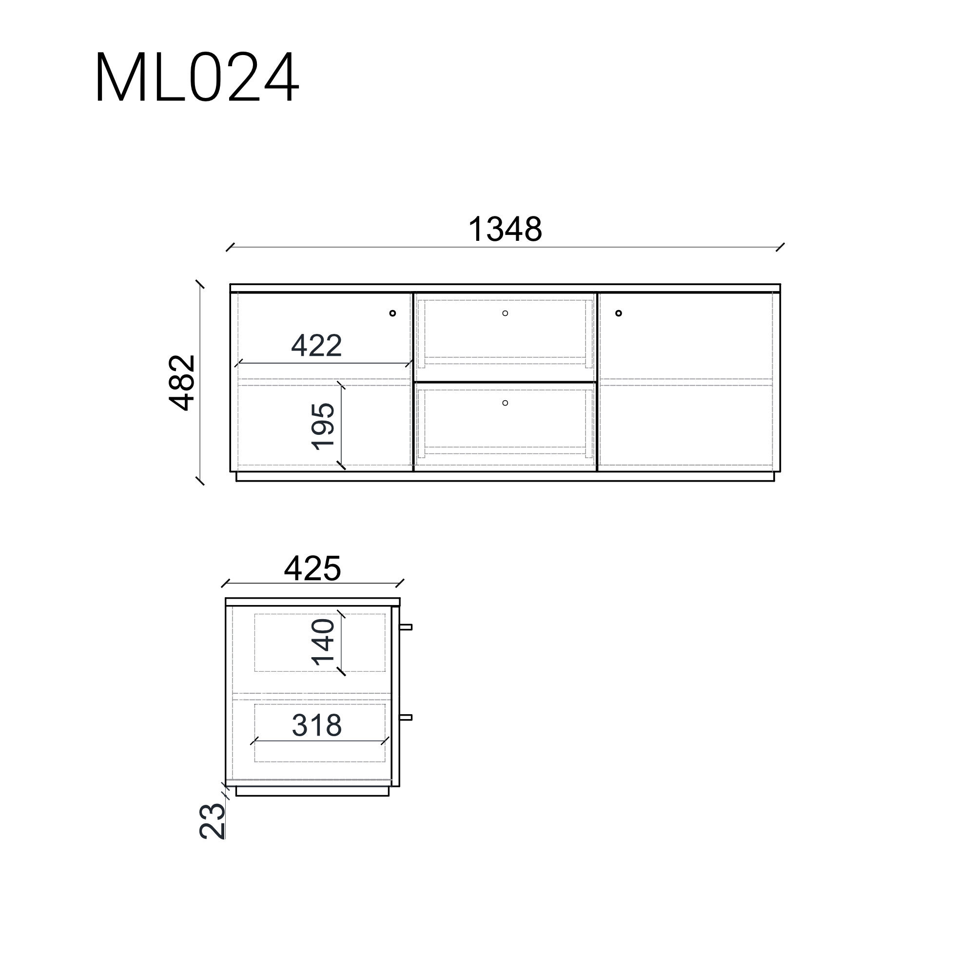 Монолитная форма и выверенная геометрия тумбы под ТВ ML024 скроет домашние вещи от лишних глаз и оставит в центре внимания фасады с объемной гравировкой. Крышка комода может быть покрыта эмалью в цвет корпуса или шпоном дуба в цвет цоколя – эта деталь придает комоду завершенный и гармоничный вид.