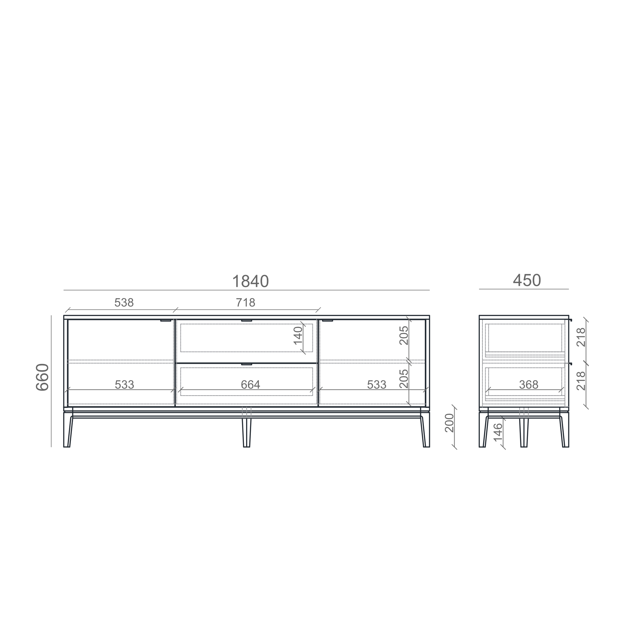 Тумба под ТВ с увеличенной длиной, станет украшением просторной гостиной и позволит организовать комфортное хранение вещей. Внутреннее наполнение тумбы состоит из двух выдвижных ящиков и двух боковых секций с полками, положение которых можно регулировать.