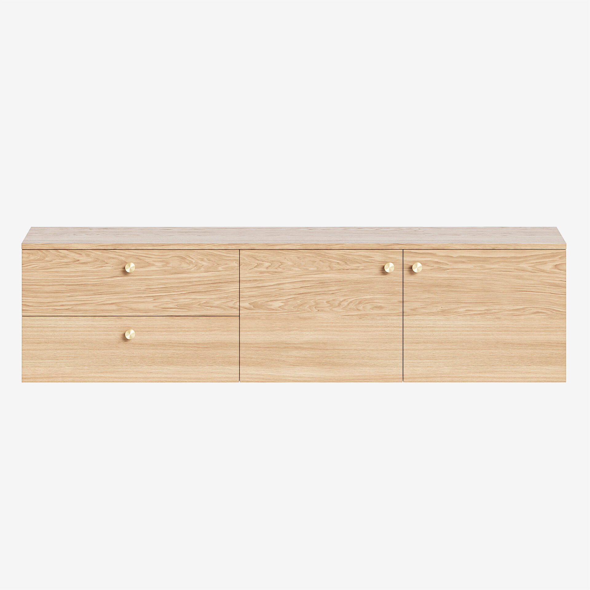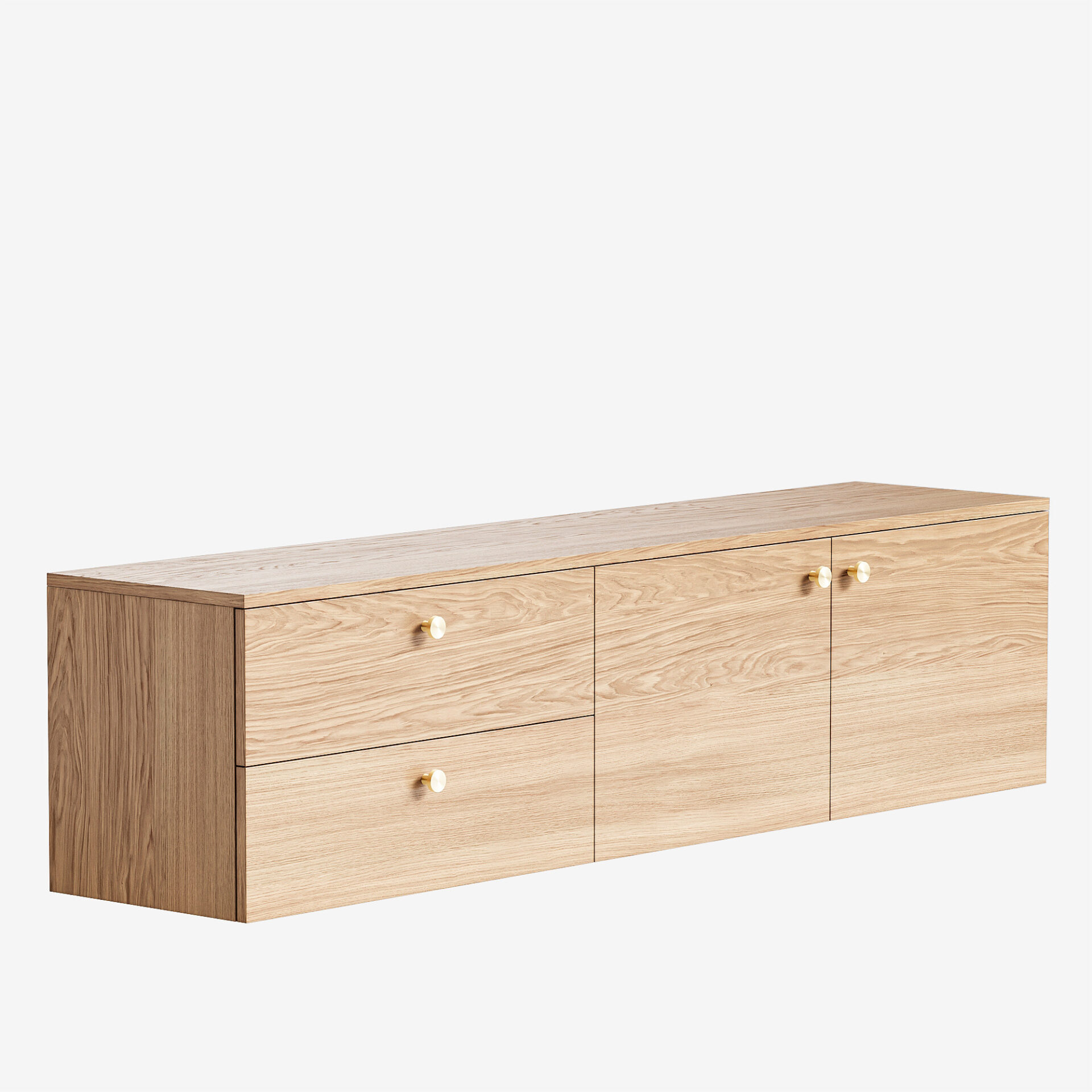 Подвесная тумба с выдвижными ящиками и секциями с полками буквально парит в