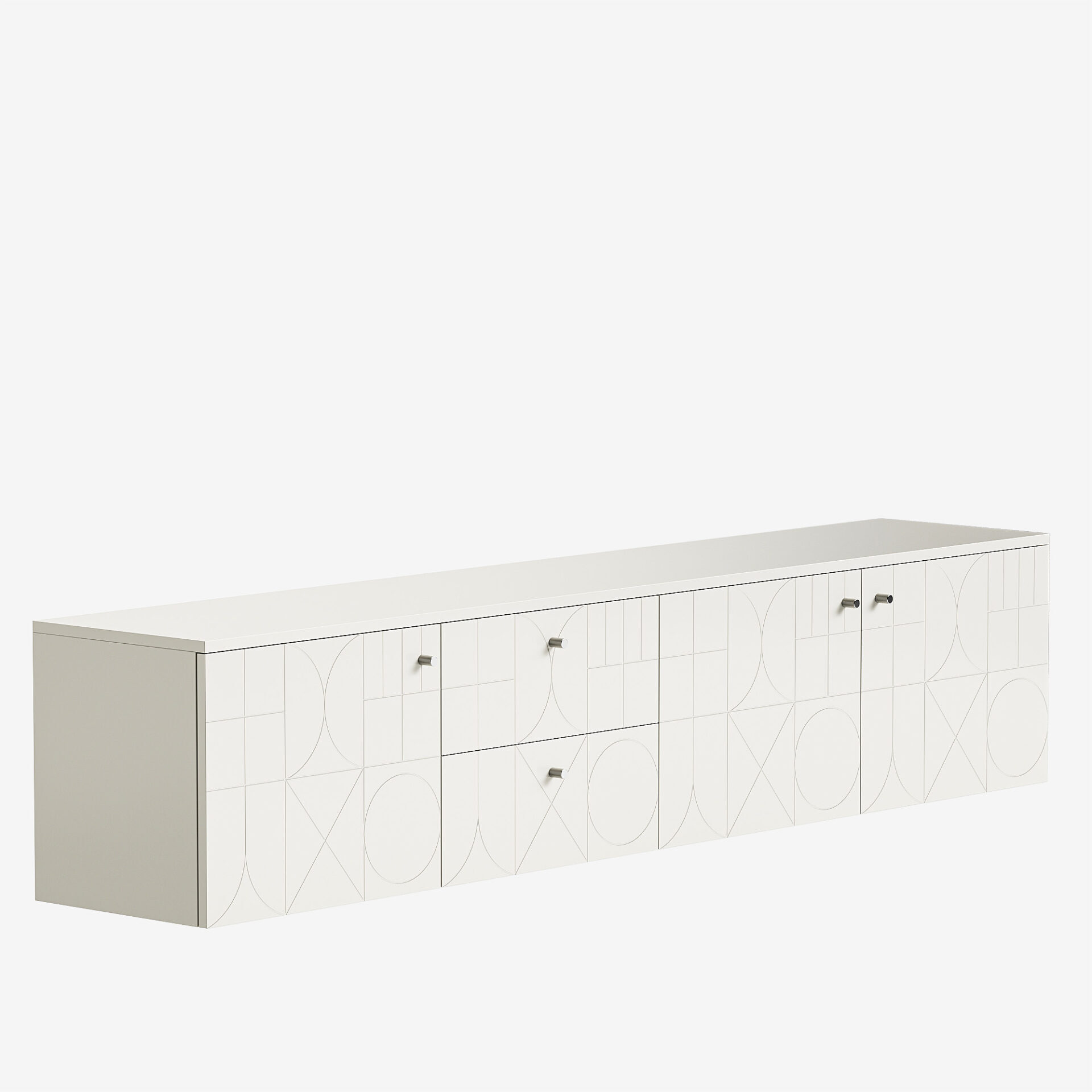 Подвесная тумба с выдвижными ящиками и секциями с полками буквально парит в