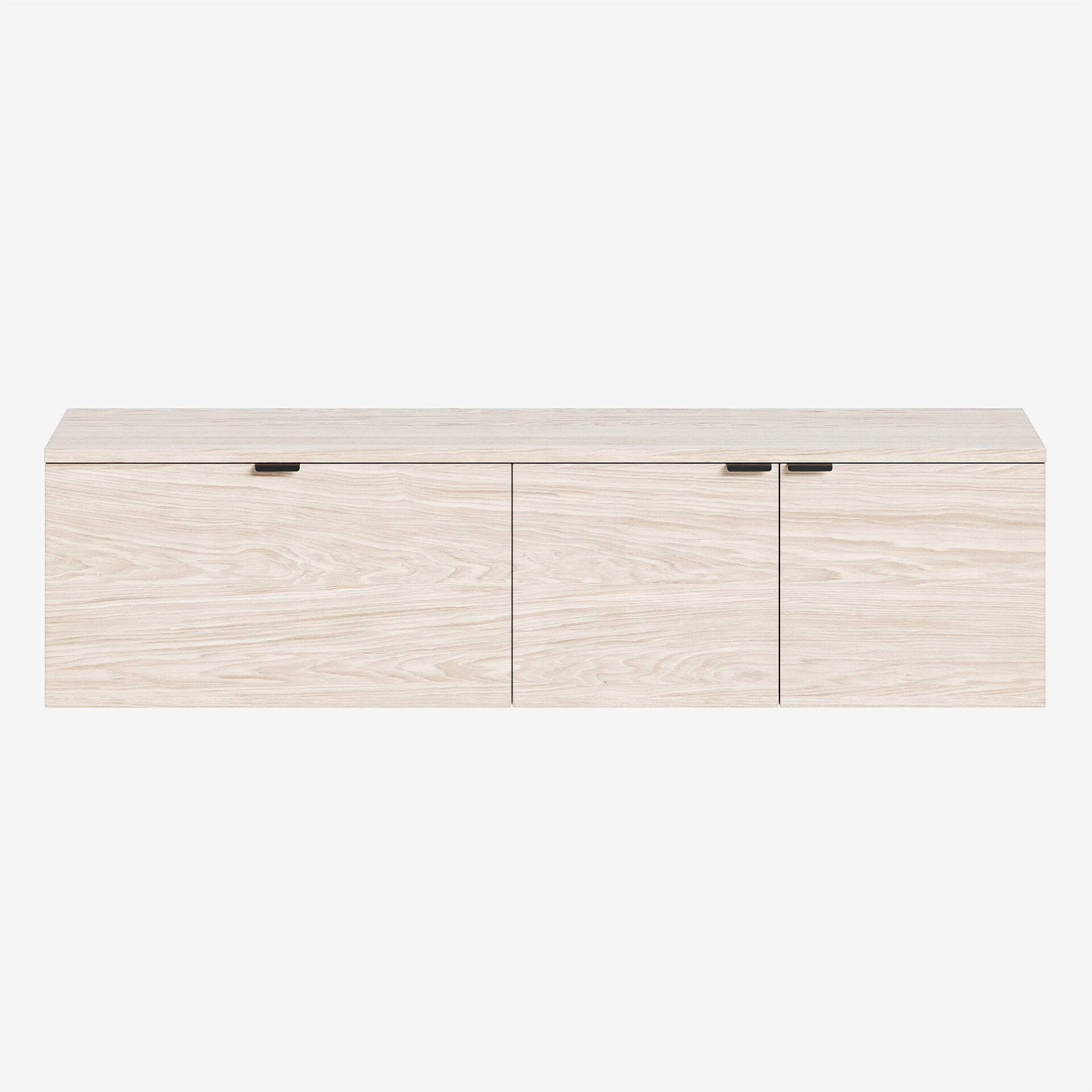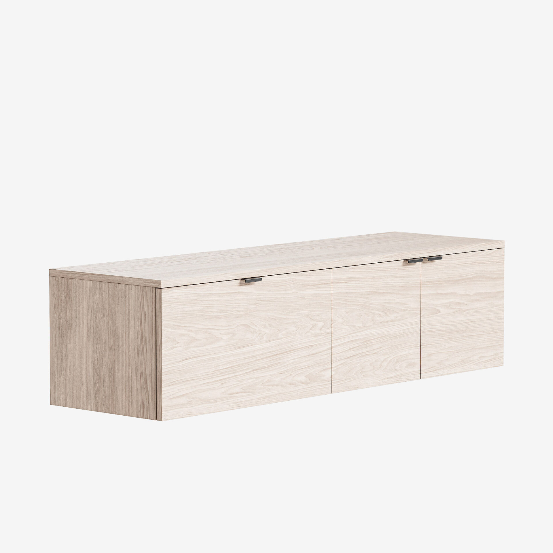 Подвесная тумба с выдвижными ящиками и секциями с полками буквально парит в
