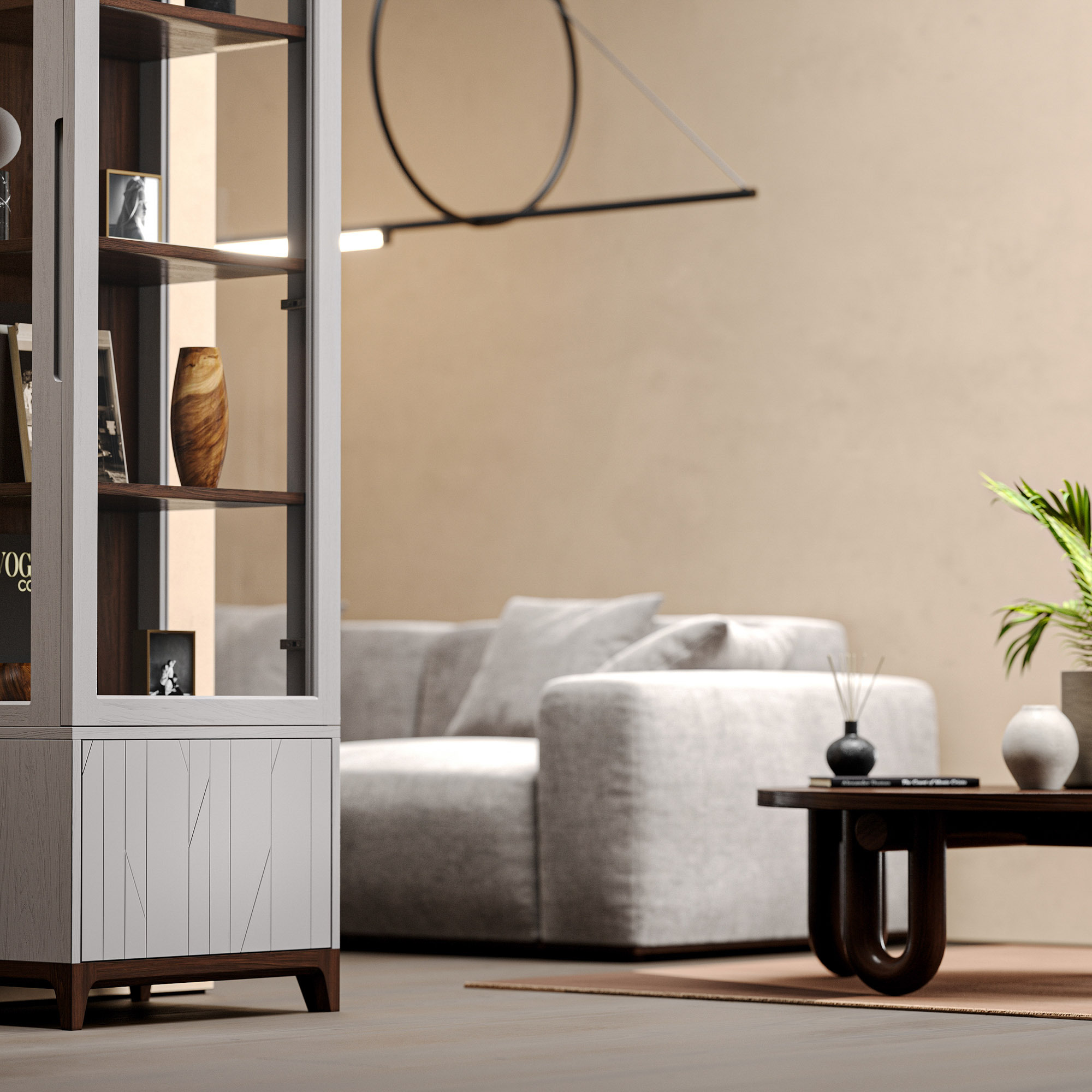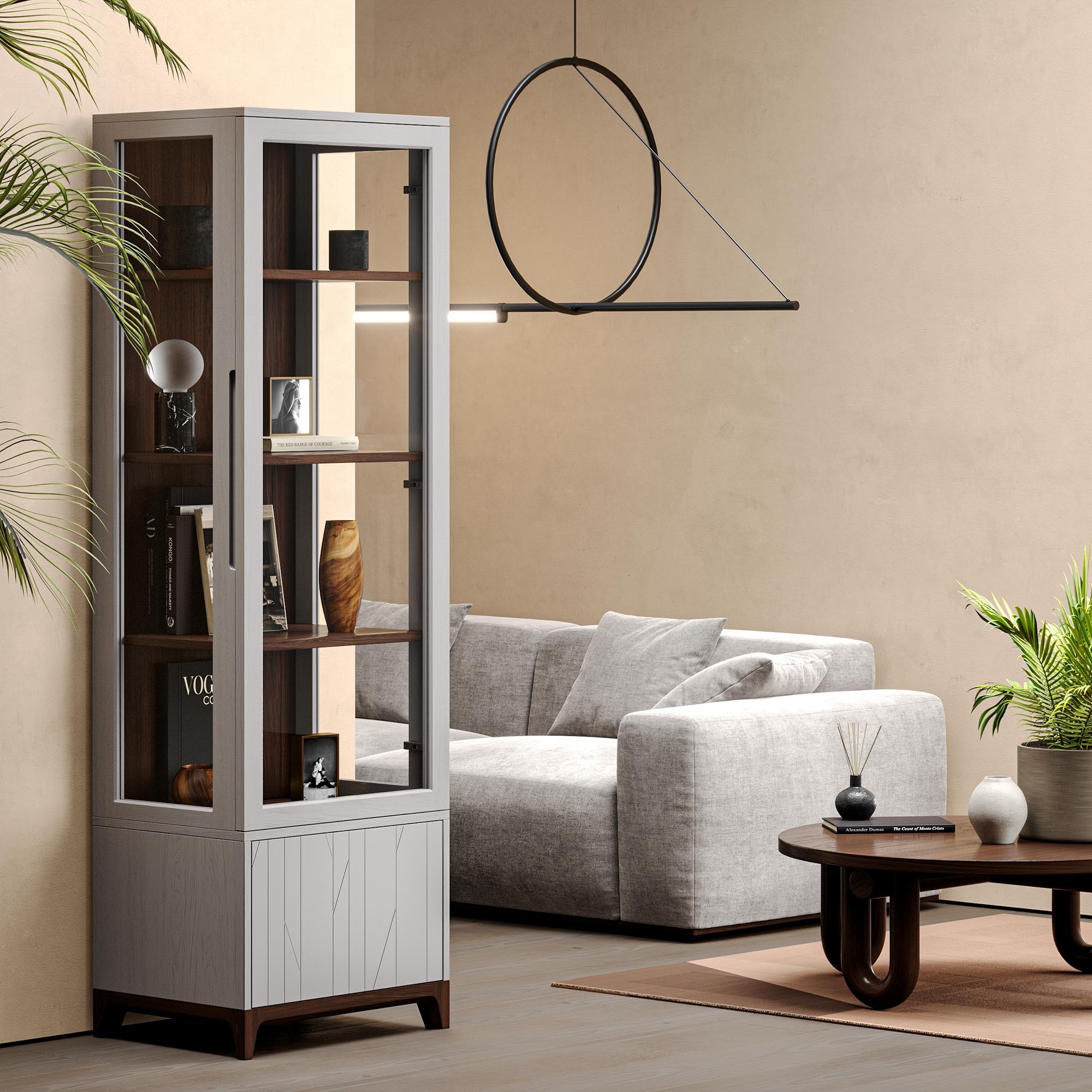Узкая витрина из коллекции CASE станет украшением любого интерьера. Компактные габариты позволят разместить ее даже в небольших пространствах. Элегантные стеклянные фасады с трех сторон придают легкость конструкции и защищают от пыли хранящиеся в ней предметы. Витрина состоит из четырех секций с полками и выдвижным ящиком, который скрыт за фасадом с авторской гравировкой. Витрину можно использовать как самостоятельно, так и собрать гарнитур из нескольких предметов, формируя завершенный и благородный интерьер.