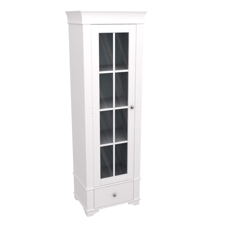 Витрина со стеклянной дверью. Один выдвижной ящик в нижней части и три полки за дверью.