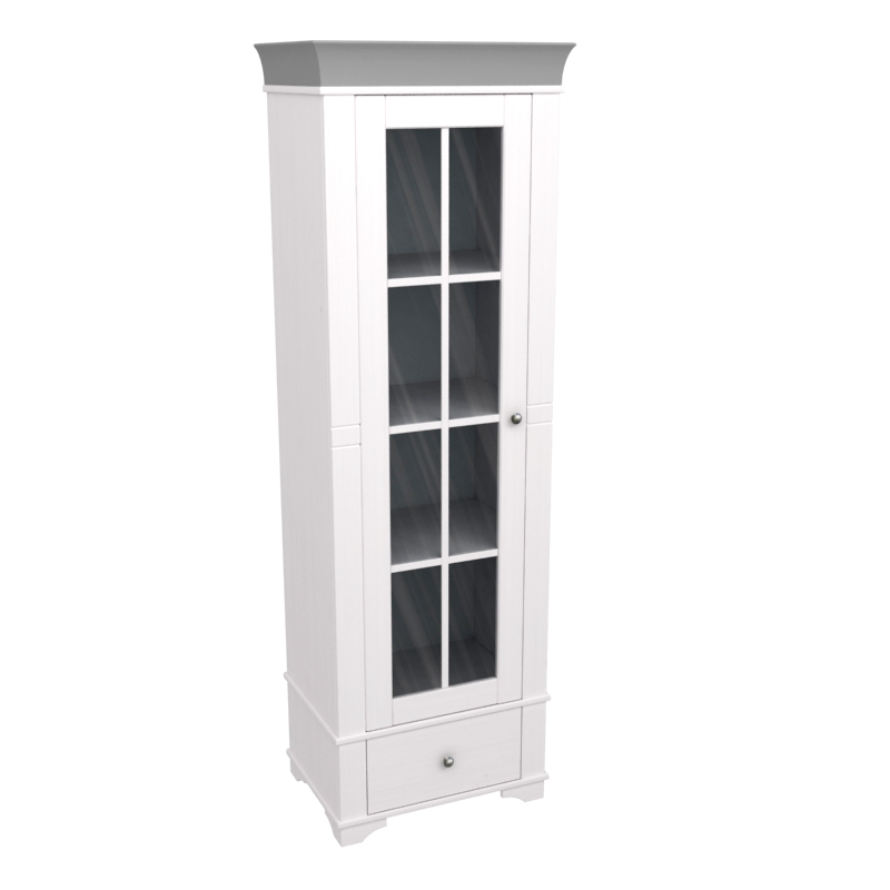 Витрина со стеклянной дверью. Один выдвижной ящик в нижней части и три полки за дверью.