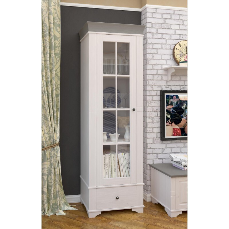 Витрина со стеклянной дверью. Один выдвижной ящик в нижней части и три полки за дверью.