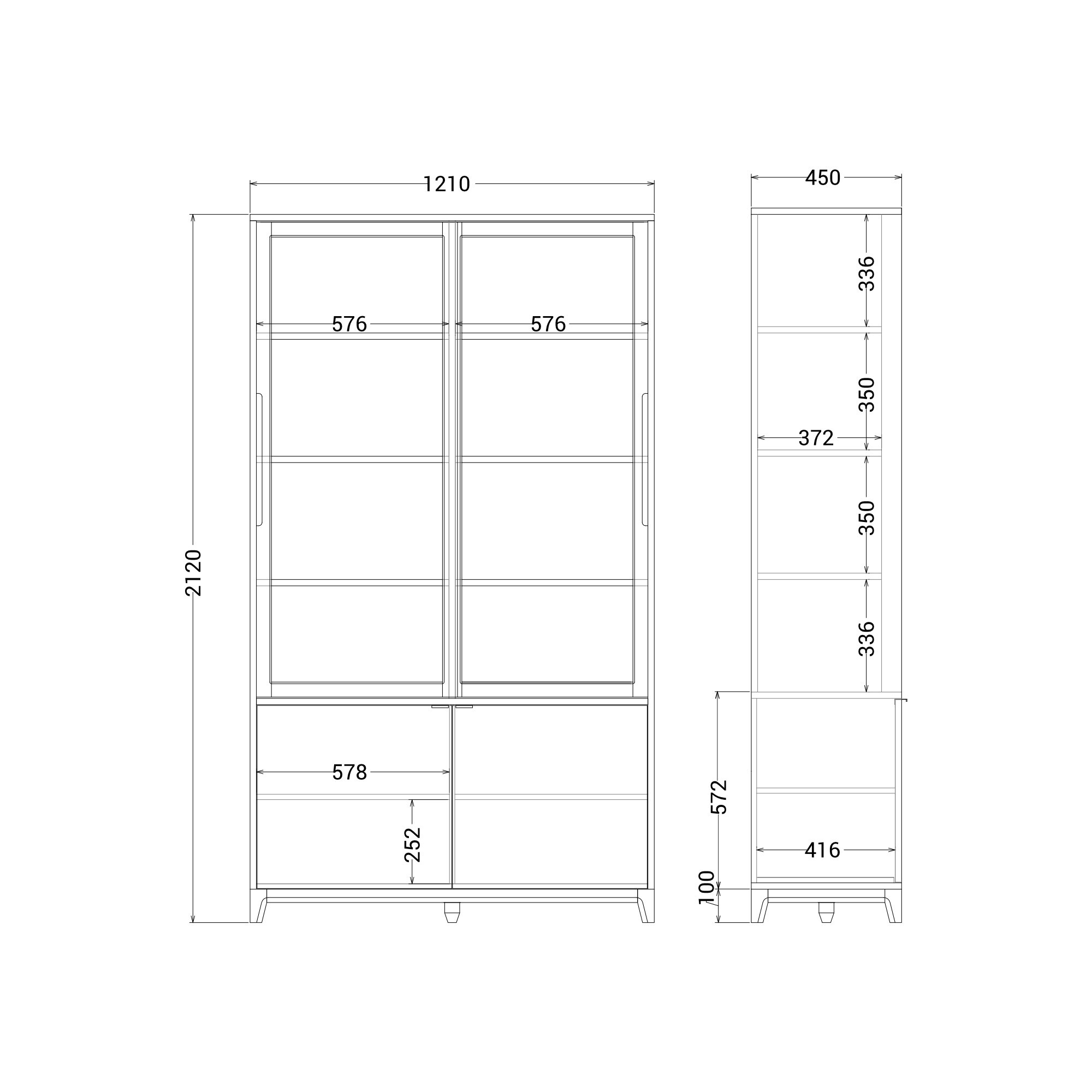 Высокая витрина поможет организовать домашние коллекции, помня о главном – стильном интерьере и комфорте. В нижней секции найдется место для объемных и весомых вещей, а на полках — для праздничного декора, бокалов и книг.