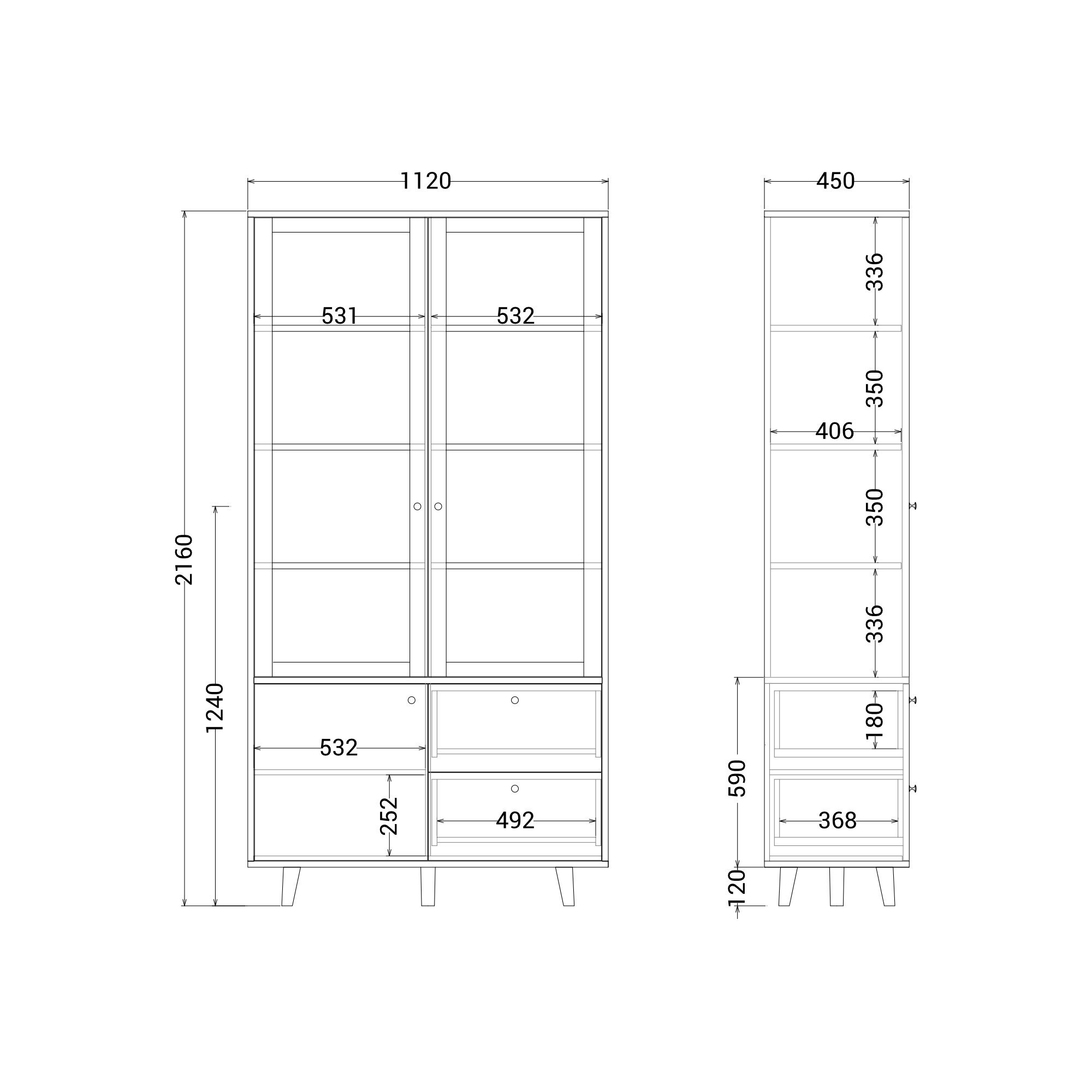 Витрина TWIN на изящных ножках поможет организовать правильное и комфортное хранение, став один из самых заметных предметов в интерьере. Свет, проникая сквозь элегантные стеклянные фасады витрины, выгодно подчеркивает красоту хранящихся в ней предметов. Витрина имеет восемь вместительных полок и три нижних ящика. В ящиках найдется место для более габаритных объемных вещей, а на полках — для декора, посуды или книг.