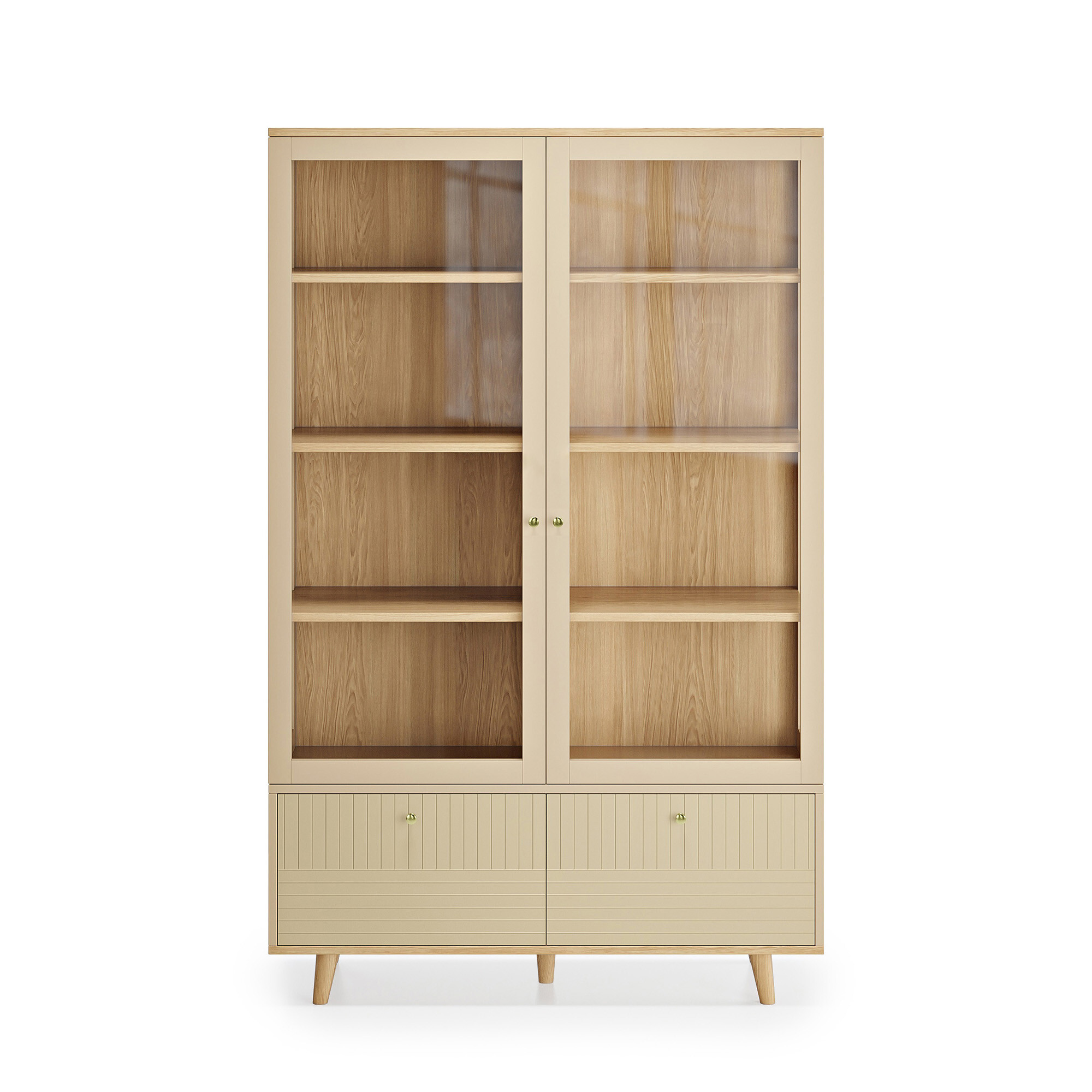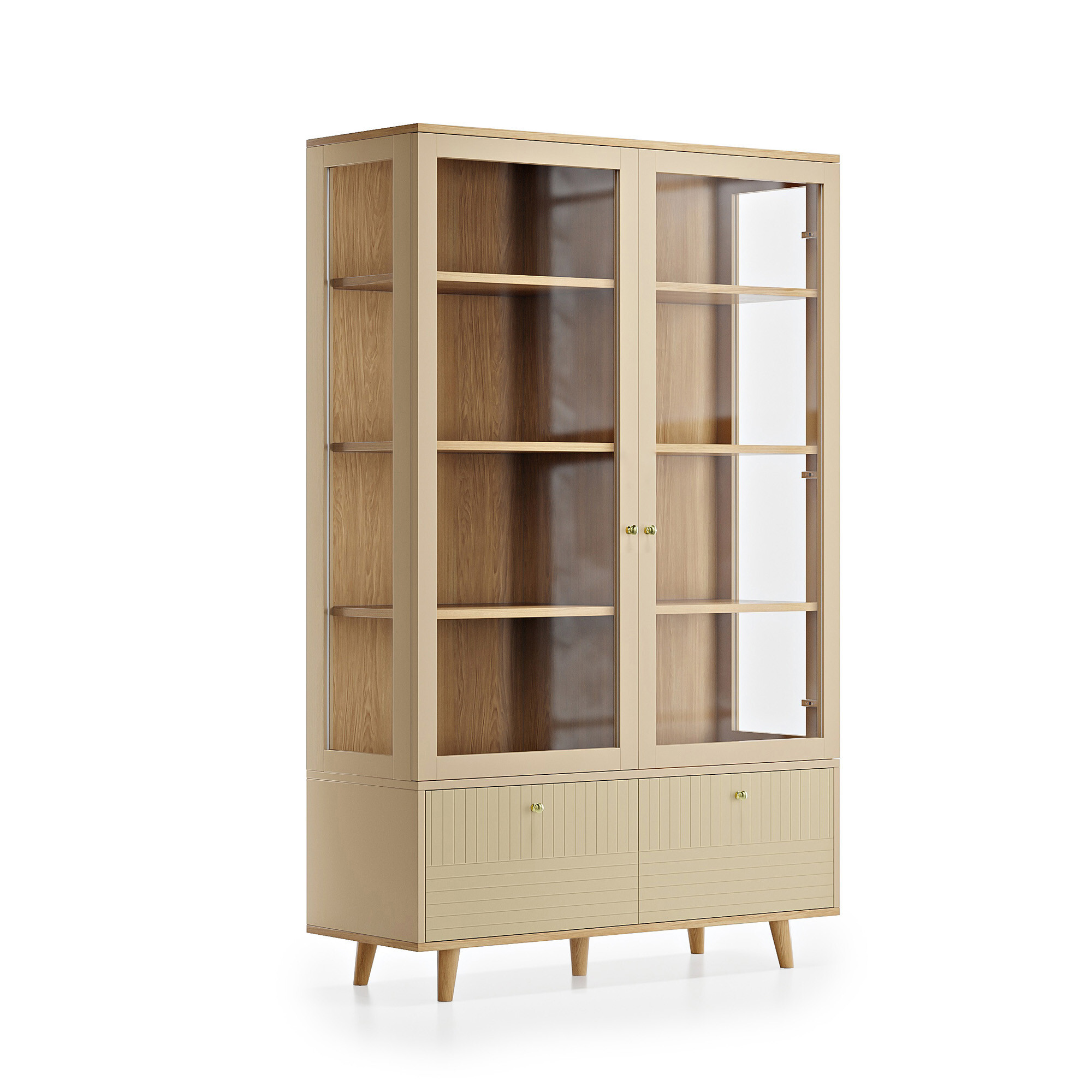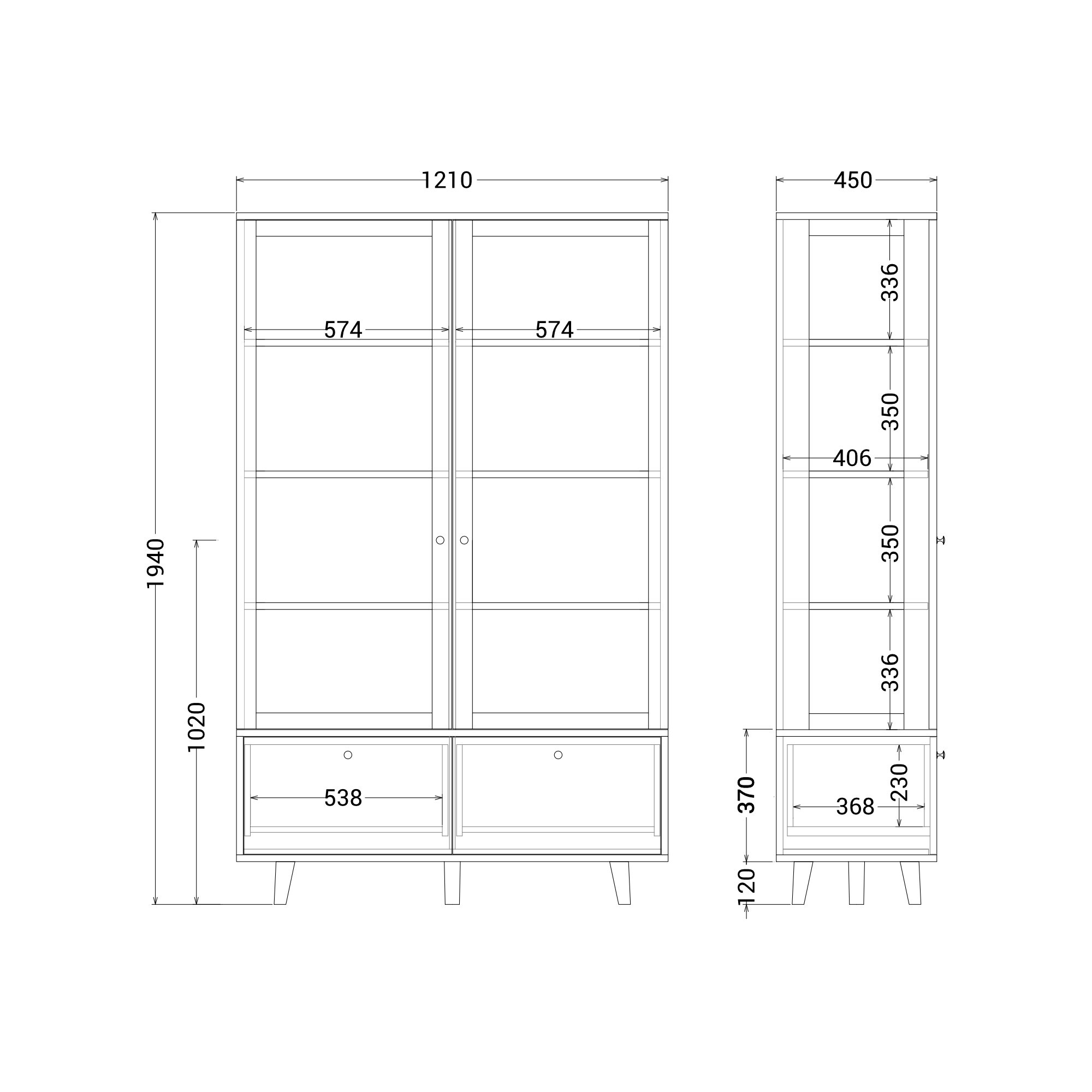 Витрина TWIN с изящными ножками и стеклянными фасадами поможет организовать правильное и комфортное хранение, не забывая о главном – стильном интерьере. Свет, проникая сквозь элегантные стеклянные фасады витрины, выгодно подчеркивает красоту хранящихся в ней предметов. Витрина имеет восемь вместительных полок и два выдвижных. В ящиках найдется место для более габаритных объемных вещей, а на полках — для декора, посуды и книг.