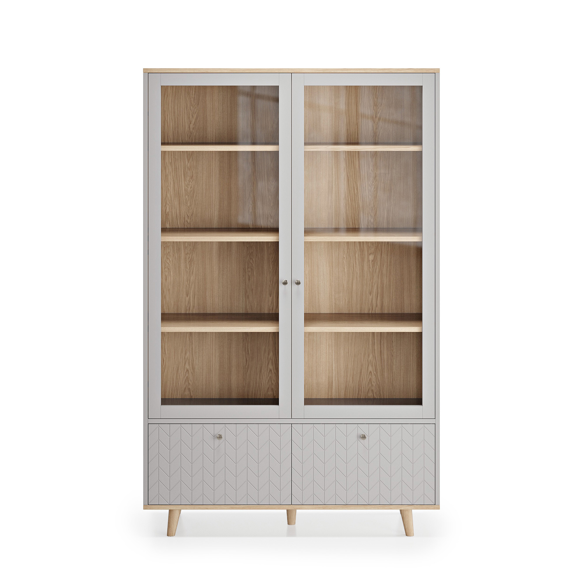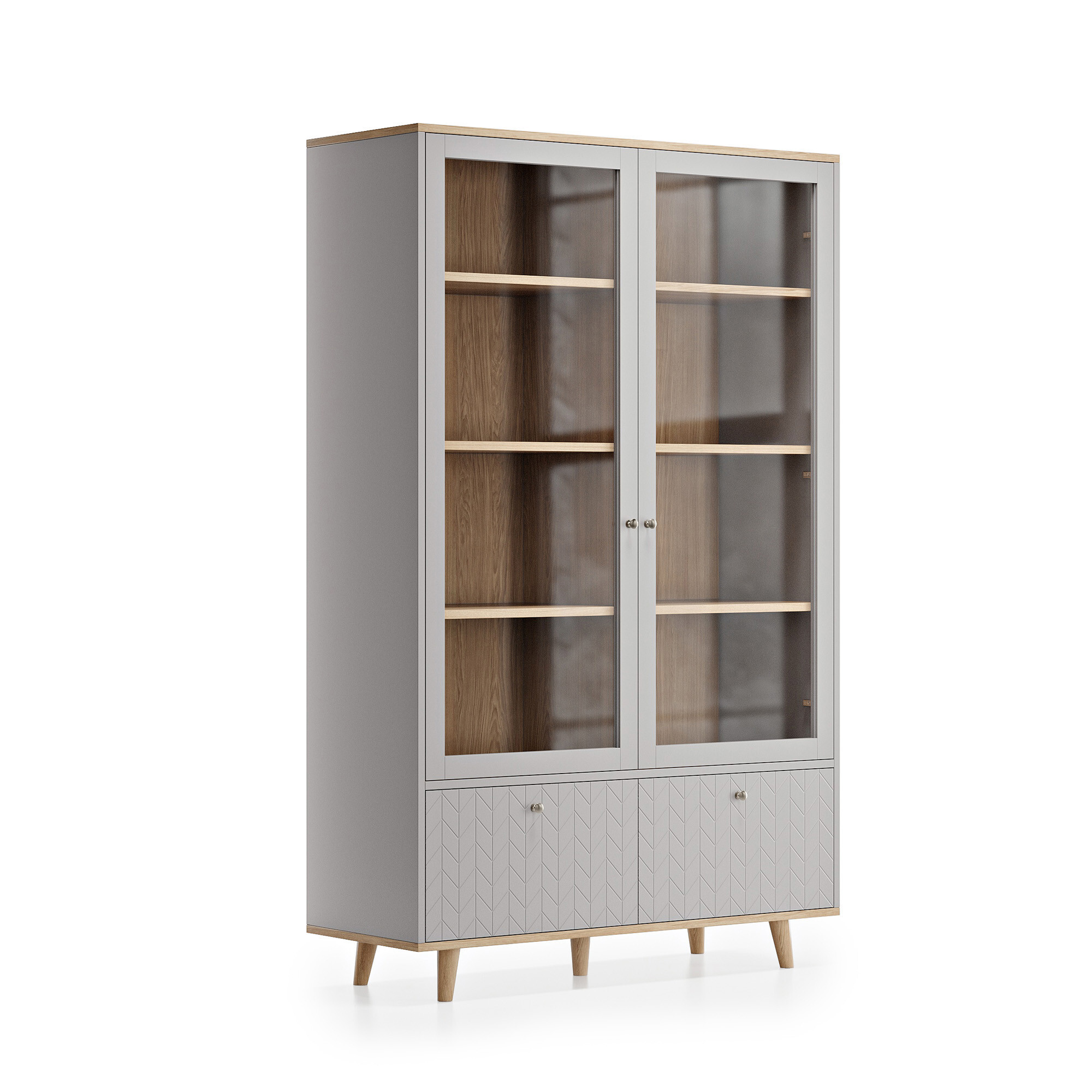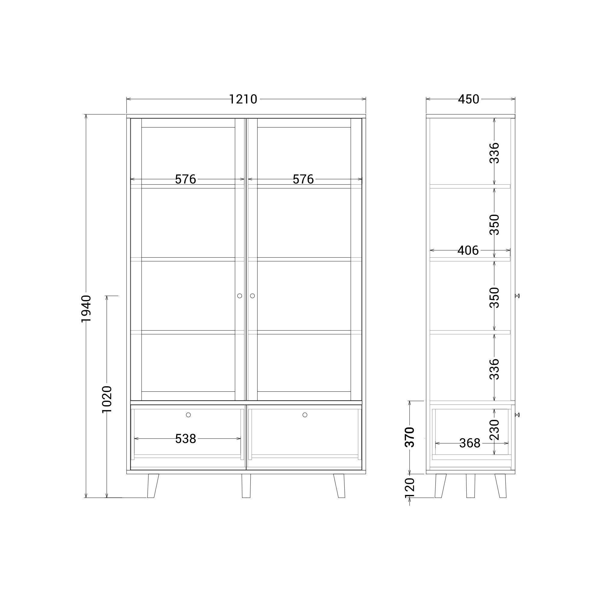 Витрина TWIN с изящными ножками и стеклянными фасадами поможет организовать правильное и комфортное хранение, не забывая о главном – стильном интерьере. Свет, проникая сквозь элегантные стеклянные фасады витрины, выгодно подчеркивает красоту хранящихся в ней предметов. Витрина имеет восемь вместительных полок и два выдвижных ящика. В ящиках найдется место для более габаритных объемных вещей, а на полках — для декора, посуды и книг.