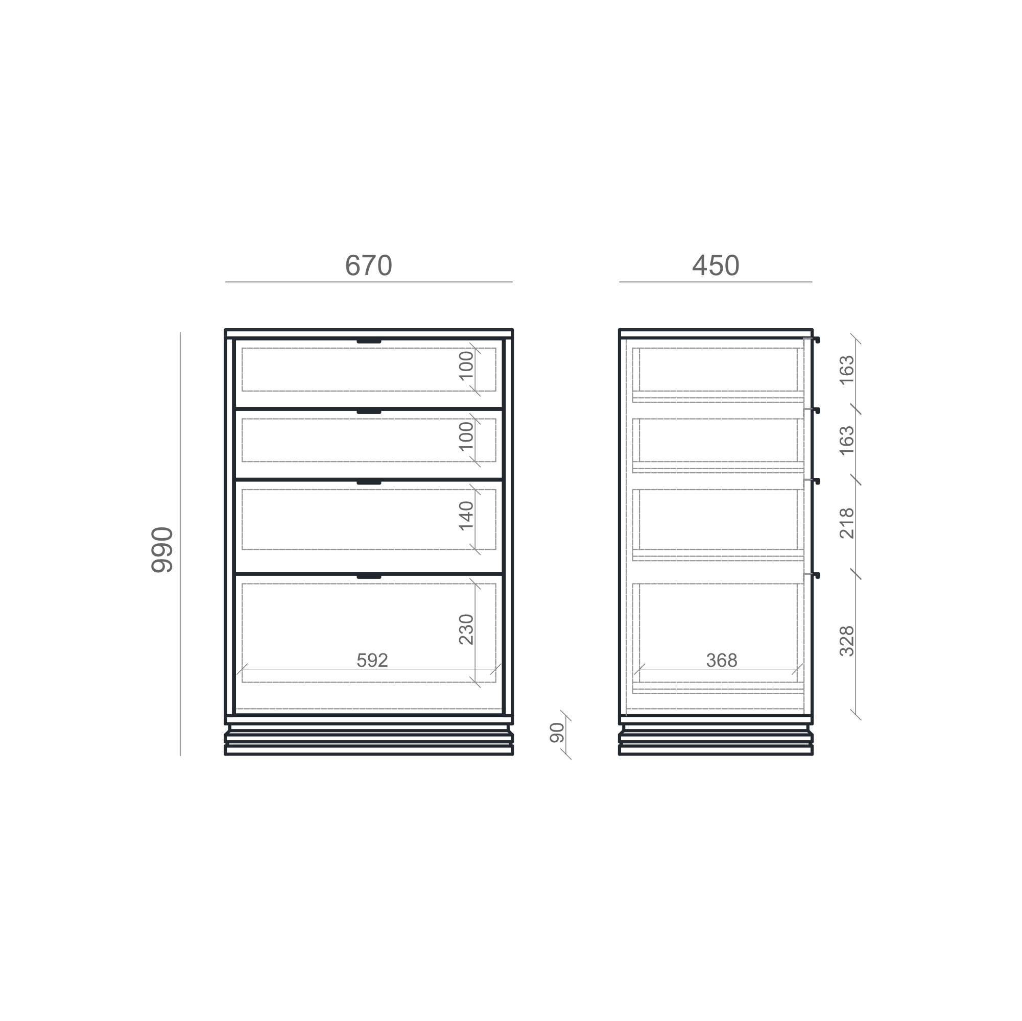 Четыре вместительных выдвижных ящика создают универсальную систему для хранения одежды, белья и аксессуаров.